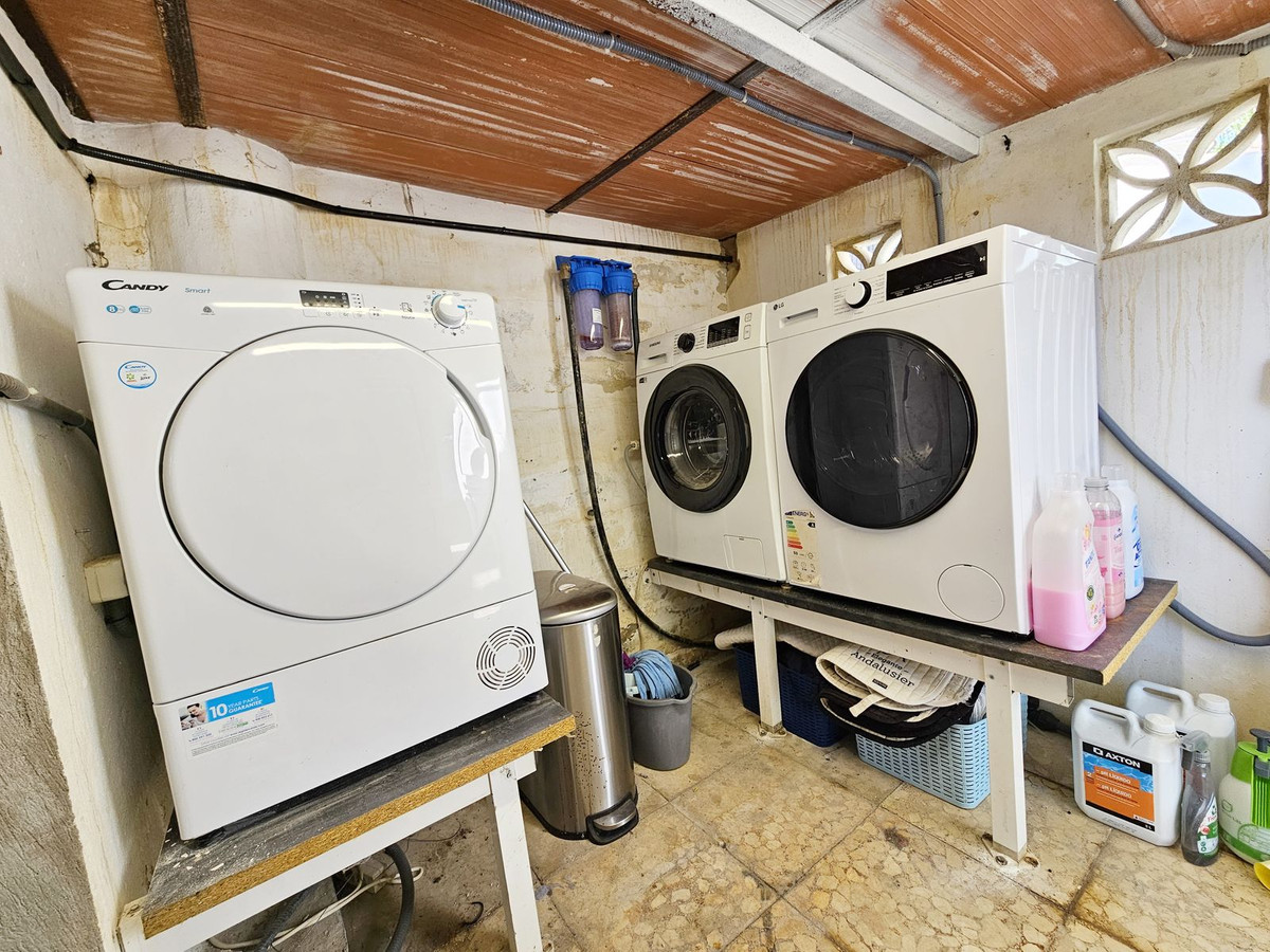 The villa sits on a generous, low-maintenance plot. The entrance level provides private parking for several vehicles and access to a secure garage. At the rear, you’ll find a spacious covered terrace perfect for alfresco dining, alongside a large utility room. Steps lead up to the upper level, where a private swimming pool awaits, complete with another shaded seating area for relaxing or entertaining.