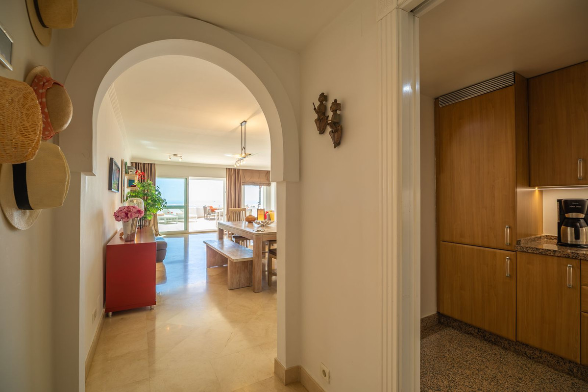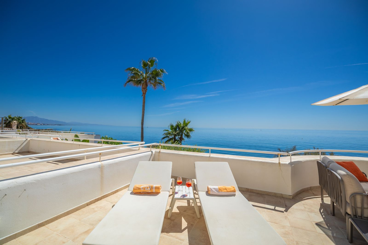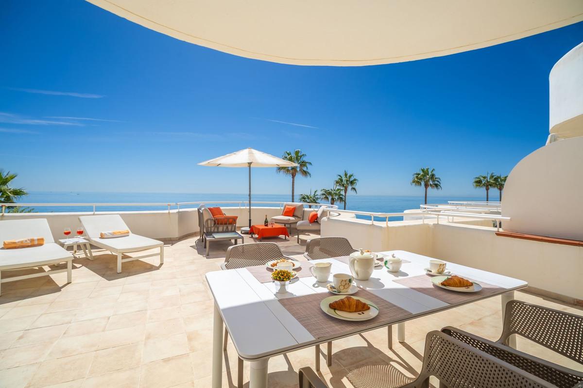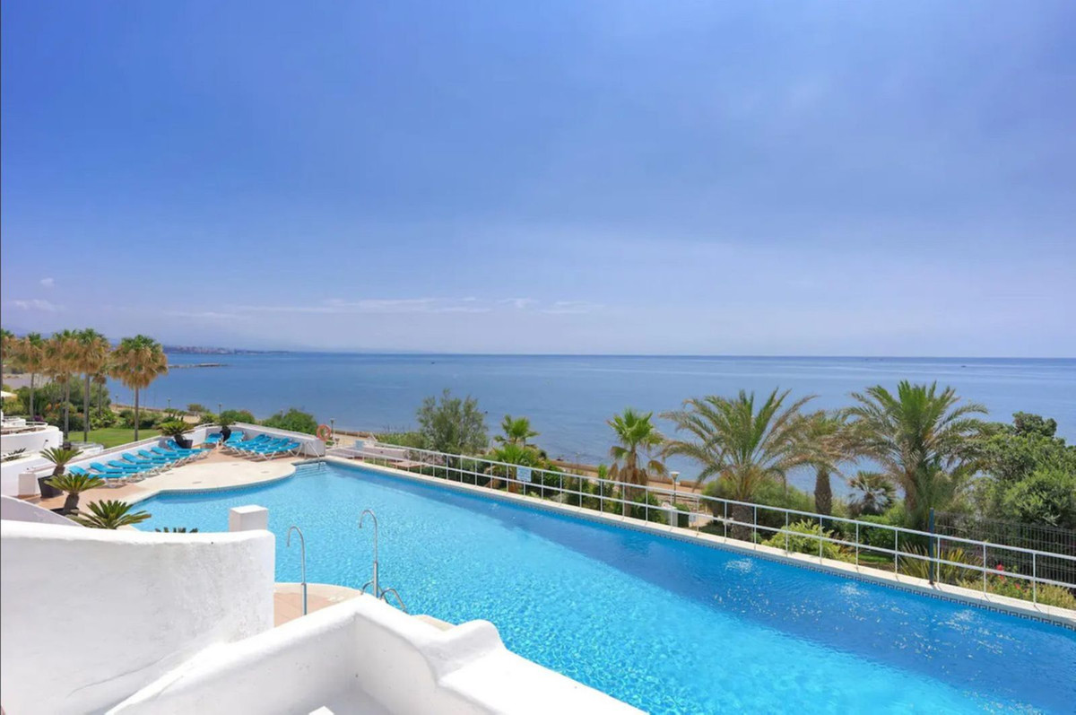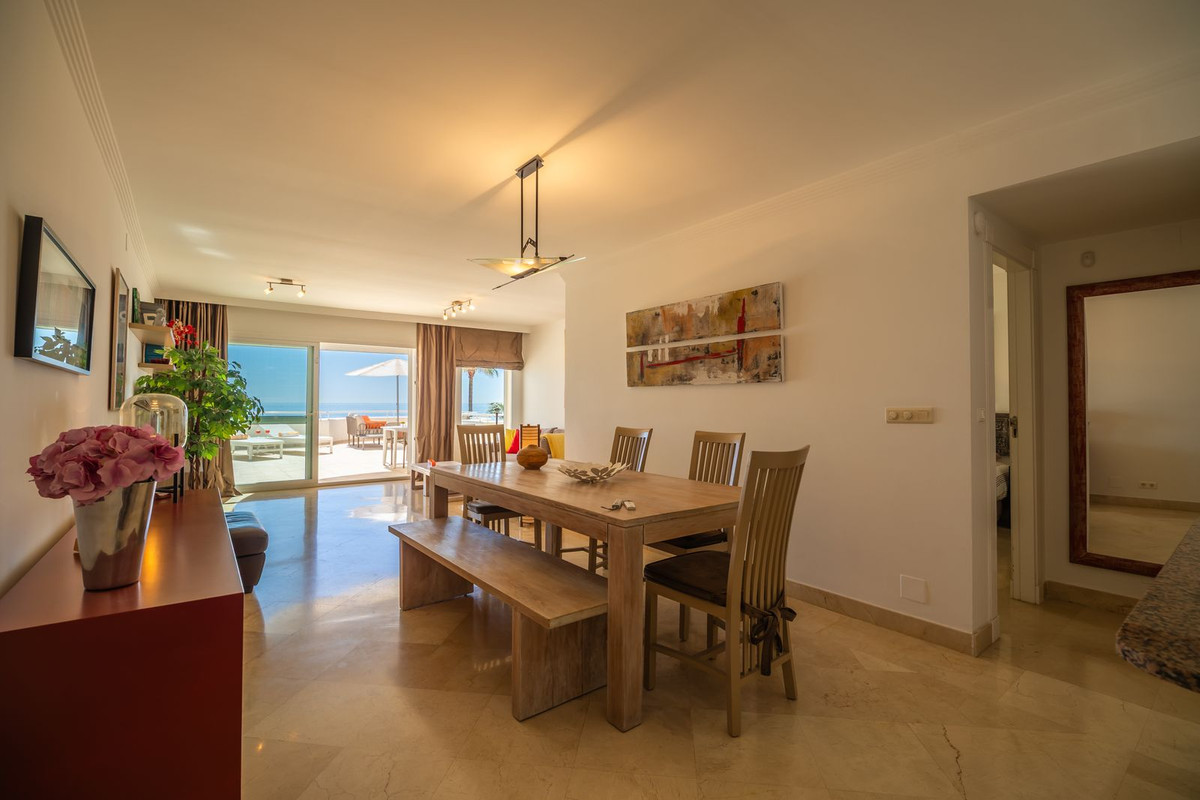 MAGNIFICENT BEACHFRONT APARTMENT WITH STUNNING VIEWS OF THE SEA, BEACH, MOUNTAINS AND THE AFRICAN COAST, FEATURING A SPACIOUS 77m² TERRACE. This property is located in the Estepona area, between Estepona town and the charming Puerto de la Duquesa — just a 5-minute drive from all kinds of amenities and several golf courses of varying levels, including the award-winning Finca Cortesín, consistently recognized as Spain’s best golf resort and host of prestigious tournaments such as the 2023 Solheim Cup and the Volvo Masters. Conveniently situated on the same level as the parking area, with direct access to the residence, the apartment also enjoys an elevated position (4th floor) above sea level from the terrace. Facing southeast, it offers panoramic sea views over beautifully landscaped gardens stretching all the way to Africa — the perfect setting to enjoy spectacular sunrises. The development is very well maintained, with spacious green areas and a large swimming pool. A garage parking space and storage room are included. We highly recommend a viewing — JUST LISTED!