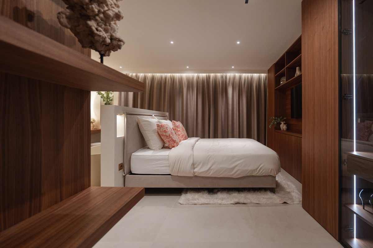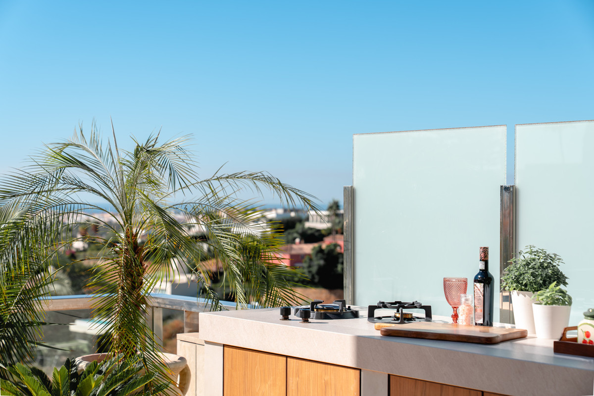 The expansive 155m² terrace is thoughtfully designed with multiple zones, including an outdoor kitchen with lighting, double gas burners, and preparation for a fridge, as well as a chill-out area and plunge pool — perfect for entertaining or relaxing against the spectacular coastal backdrop.