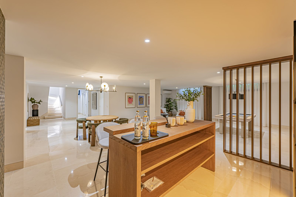 Elegant contemporary-style villa spread over three and four floors with a total of five bedrooms, five bathrooms, a large living room with an open-plan kitchen and dining area, a spectacular basement with a home theater, bar, billiards table, and a large solarium with beautiful sea and mountain views.