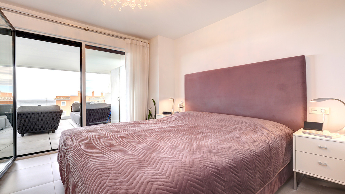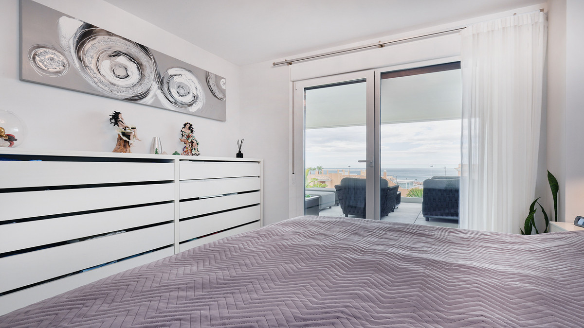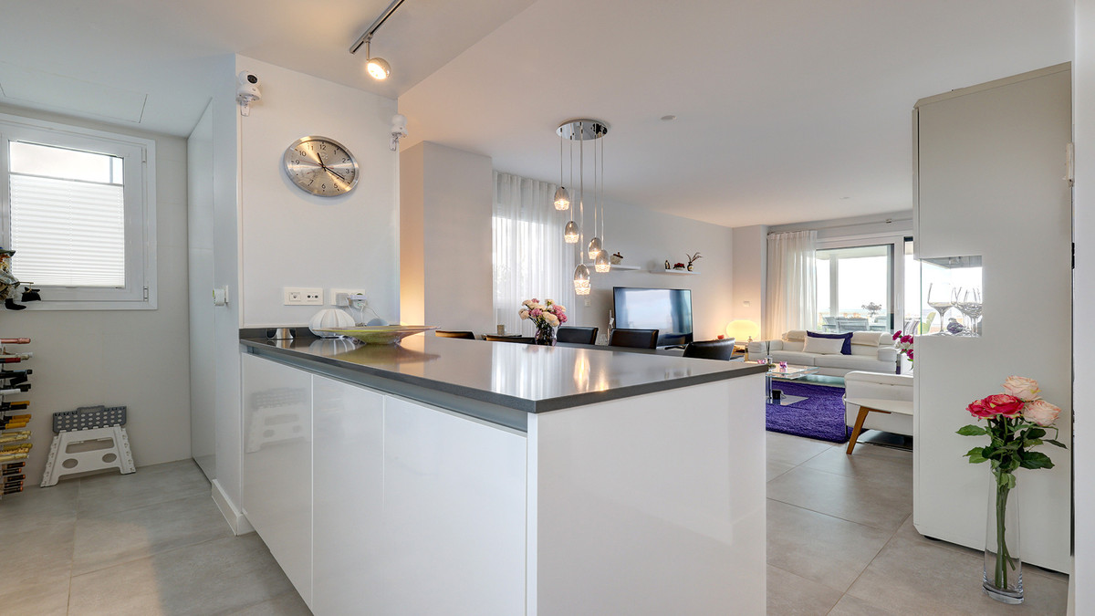 Straight ahead, the open-plan kitchen, dining, and living area is light-filled and modern, seamlessly leading out onto the large terrace, ideal for dining al fresco or enjoying the long, sunny Spanish afternoons while soaking in the stunning sea views.