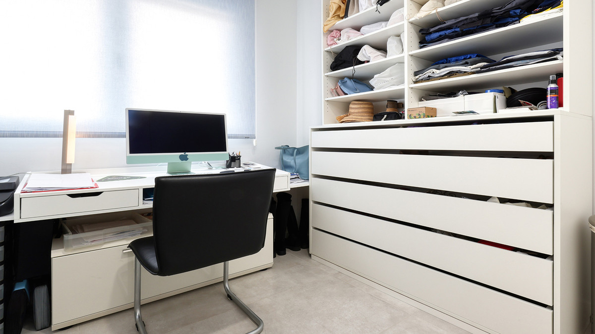 As you enter the property, you’re welcomed by a spacious hallway. To the right, you’ll find the master bedroom featuring an en-suite bathroom and direct access to the expansive terrace, perfect for morning coffee with sea breezes. To the left, two additional bedrooms offer flexibility; one is currently styled as an office/walk-in wardrobe. These rooms share a modern family bathroom.