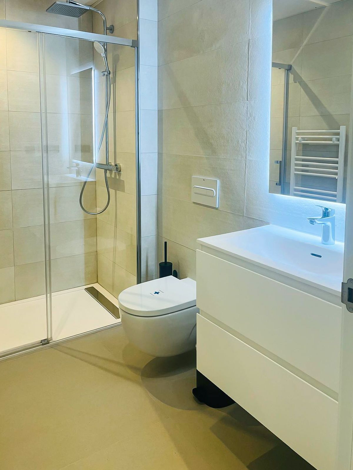 Offering 2 bedrooms and 2 bathrooms. The main bedroom has an open plan bathroom with walk-in shower, anti-fog mirrors, electric towel racks and extra wardrobes. A fully equipped and open plan kitchen with all Bosch appliances and spacious living dining area.