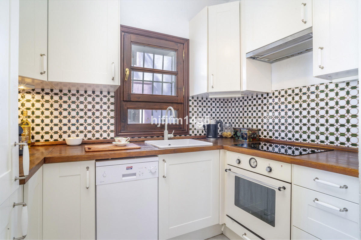Step inside to the middle level, where you’ll find a charming living area with two large sliding doors – one opening to the terrace and the other functioning as a French balcony, both framing stunning views and flooding the space with natural light. The compact yet well-designed kitchen is tucked in just off the living room – practical and efficient for daily living or holiday stays.