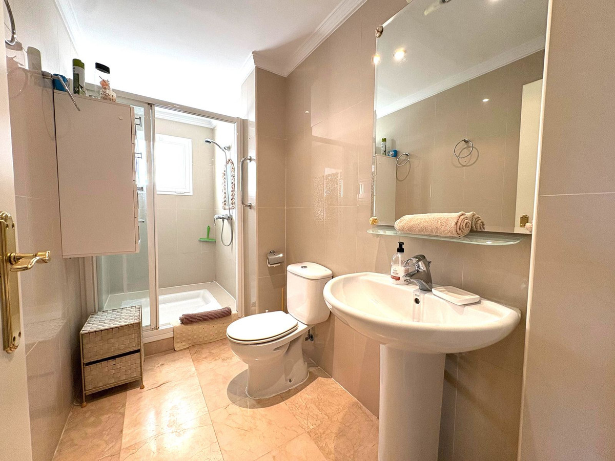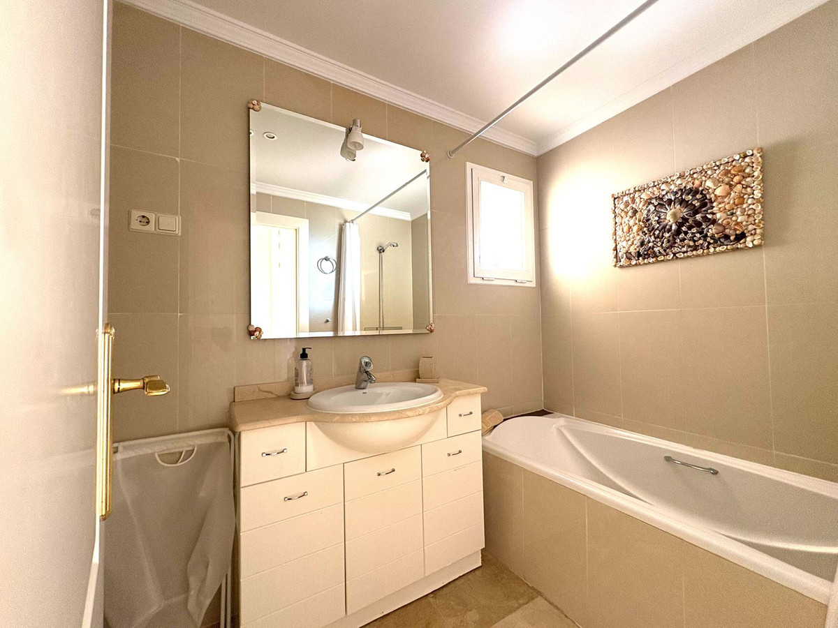 Expansive and tastefully decorated, this three-bedroom, two-bathroom apartment spans 116 m2 and features a spacious 42m2 lounge. The larger of the two terraces, measuring 33m2, faces East, providing breathtaking panoramic views of the picturesque landscape stretching towards Santana Golf. Meanwhile, the smaller terrace overlooks the pristine main pool and meticulously landscaped garden. Each room is equipped with individual air conditioning units for personalized comfort. The interior boasts high gloss marble floors throughout, and the kitchen is fully fitted with modern appliances. Additional amenities include underground parking, storage, a safe, video-entrance, and more. The apartment is offered unfurnished, with room for negotiation.