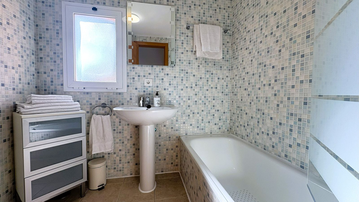High-quality finishes include marble floors, hot and cold air conditioning, and an electric sunblind in the living room.