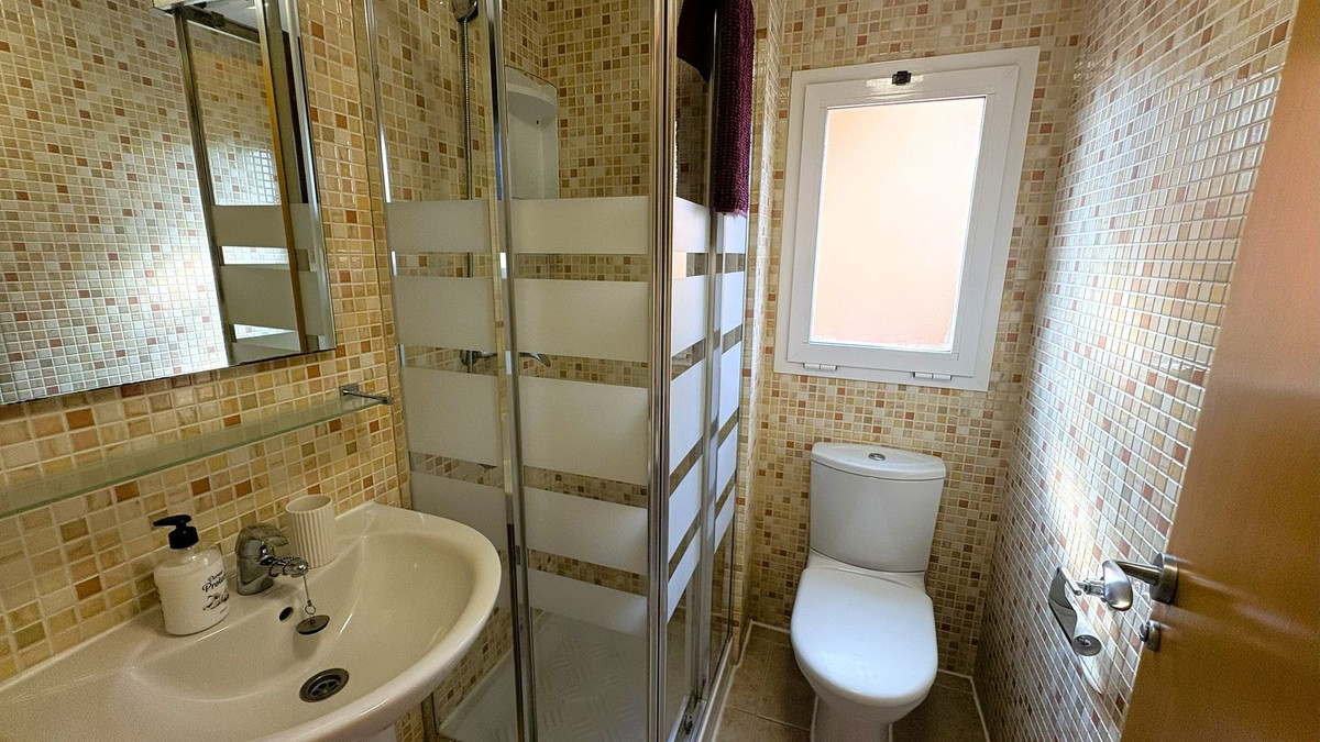 The bright lounge and dining area opens directly to the terrace, creating a seamless flow between indoor and outdoor living. A fully fitted kitchen with a separate utility room provides convenience, while the two generous double bedrooms feature fitted wardrobes. The master bedroom benefits from its own en-suite bathroom, and there is also an independent family shower room.
