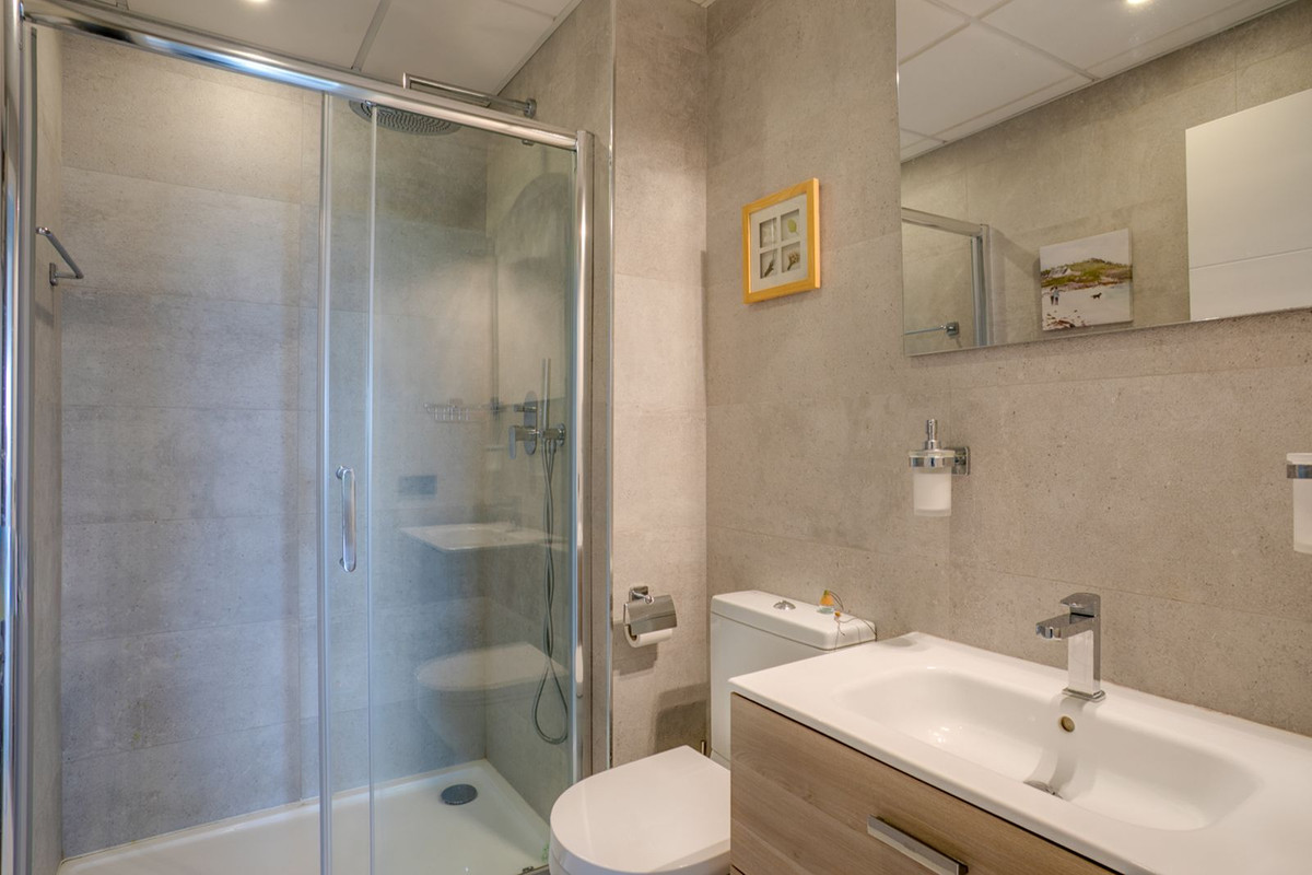 As you enter, you are welcomed into a beautifully designed living area with a semi-open, fully fitted kitchen. The space flows seamlessly onto a large covered terrace, enclosed with glass curtains, allowing you to enjoy outdoor living all year round. From here, you can soak in panoramic views of the Mediterranean Sea, the lush communal gardens, the pools, and the majestic mountains of Estepona. This beautiful property is an end unit and is not overlooked by other owners, in a block of only 5 units.