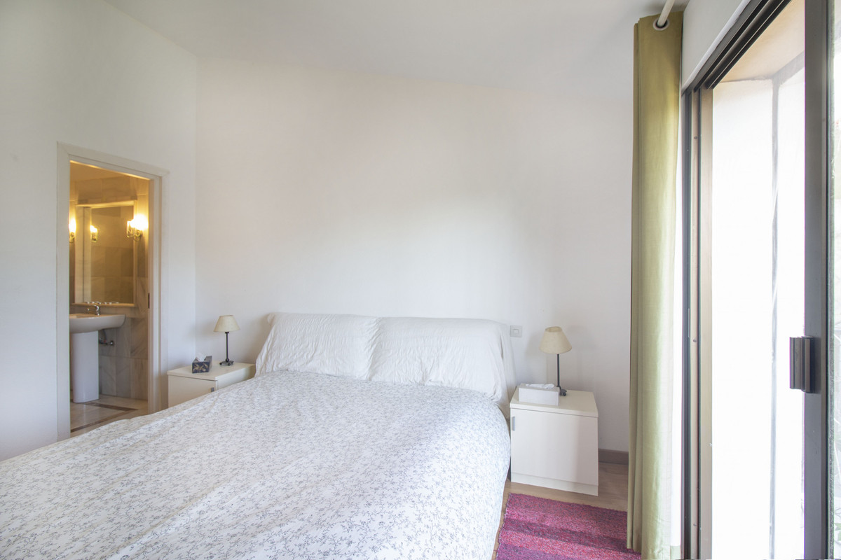 From the living room, sliding doors lead out to a covered terrace with glass curtains, providing a versatile outdoor space ideal for relaxing or entertaining in all seasons. The terrace enjoys views over the immaculately maintained communal gardens, surrounded by mature greenery and a large swimming pool that invites you to enjoy the Costa del Sol lifestyle.