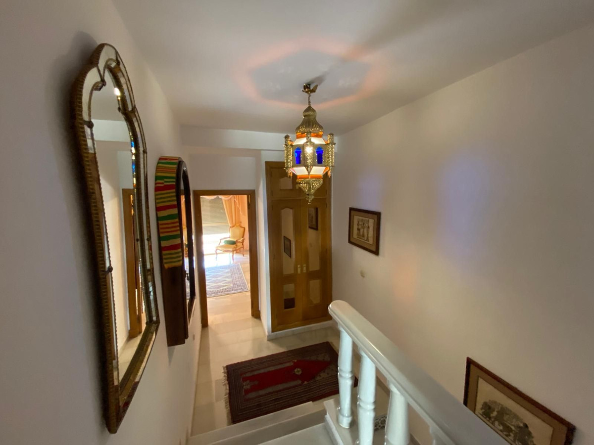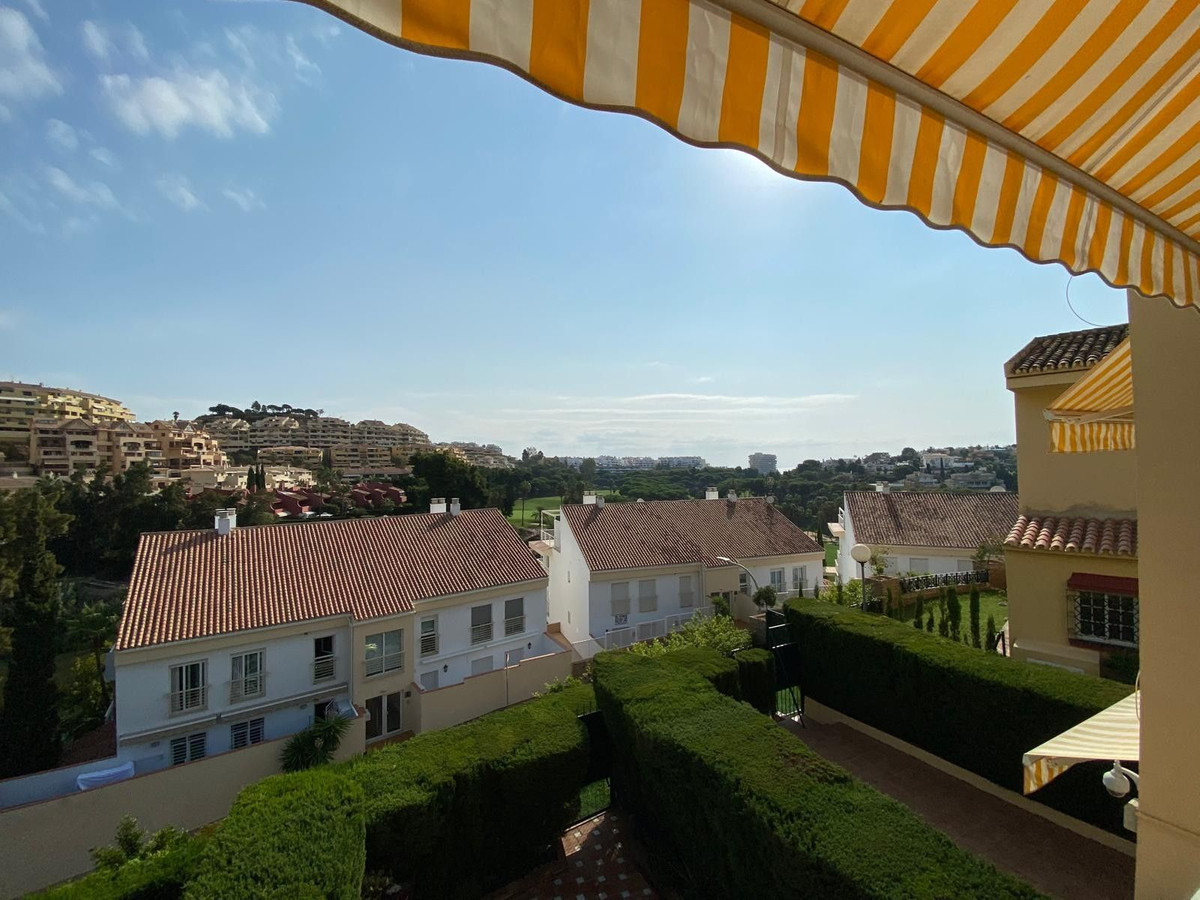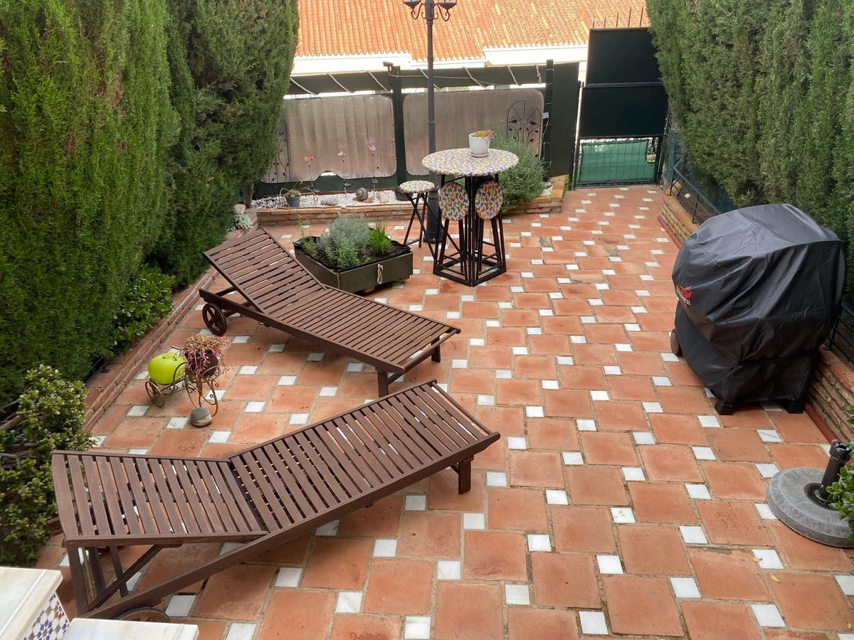 Fantastic semi-detached house in TORREQUEBRADA, in the best area of Benalmádena, in a residential development. Before entering the house, there is a small and charming garden where you can sunbathe in the afternoons. Upon entering, you enter the spacious living room with a marble fireplace that adds style and warmth, perfect for enjoying moments of relaxation. It is connected to the fully equipped kitchen by a serving hatch and a laundry area with a window. There is also a toilet on this same main floor. This home is bright as it faces east and west (morning and afternoon sun). Air conditioning and a heat pump are provided. The living room has access to a covered terrace and connects to another terrace that leads down via a staircase, where you can relax, sunbathe, and enjoy barbecues with family and friends. On the upper floor, you will find two exterior bedrooms. The master bedroom is very spacious, with a full en-suite bathroom, built-in wardrobes, and also has a terrace with beautiful panoramic views. The second bedroom is also spacious and has an en-suite bathroom. The community grounds, closed by an automated gate, offer parking for several cars. The development offers a large communal pool (semi-Olympic size, open all year round), lawns, and tropical gardens. The gardener cares for the private and communal gardens, which are included along with water usage, in the monthly community fee. The development is located in a quiet, well-connected residential area. Ideal for golf lovers, as it is very close to one of the best golf courses on the Costa del Sol (TORREQUEBRADA GOLF). Torrequebrada is home to several schools and hospitals, and is just 2 km from the beaches and several supermarkets in the area. VISITS RECOMMENDED!