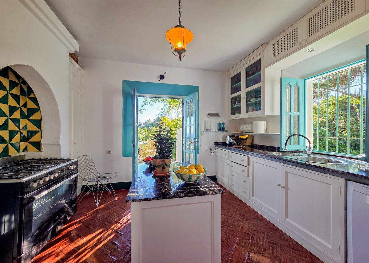 Inside, a welcoming hallway with pitched wooden ceilings sets the tone for the home’s elegant interior. To the left, a bright and airy living room with a fireplace is bathed in light, creating a warm and inviting atmosphere. The kitchen, brimming with character and vibrant colors, opens onto a dramatic suspended terrace offering breathtaking sea views, beautifully framed by bougainvillea and jacaranda trees — a perfect spot to savor alfresco meals or simply soak in the Mediterranean atmosphere.