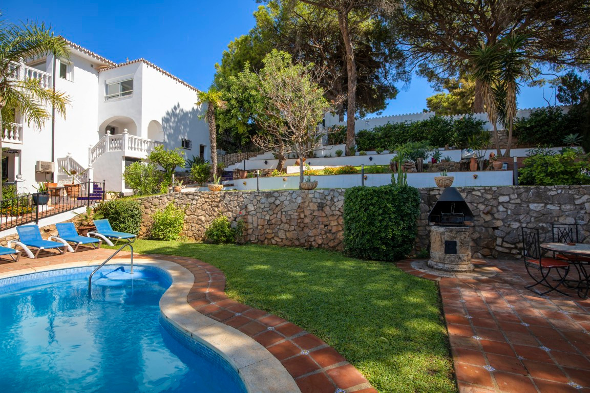 The exterior is a true Mediterranean retreat, with a lush, mature garden and water features surrounding a large private pool, complete with shower area, outdoor bathroom, and a fully equipped summer kitchen with BBQ, ideal for entertaining and enjoying the Costa del Sol climate. The property also includes a covered garage and additional on-site parking.