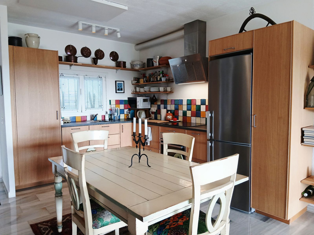 The main living area of around 30 m² features a bright open-plan living and dining room with a solid wood kitchen, creating a warm and inviting atmosphere. The space is enhanced by an elegant fireplace, LED lighting for a soft ambience, and a split-level layout that adds charm and character to the home.