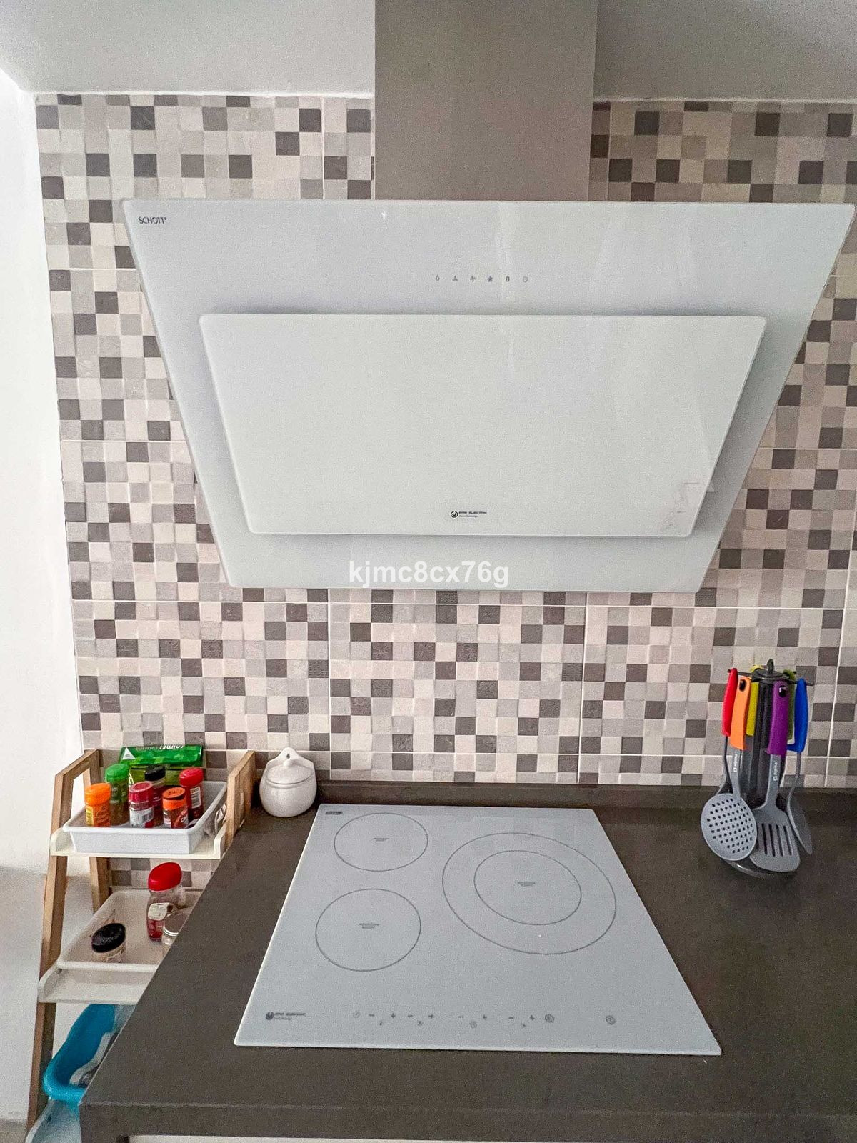 The fully open-plan kitchen is a dream for any home chef—modern, well laid-out, and generous in storage. The living-dining room is wide and bright thanks to a large floor-to-ceiling window that opens fully, plus south-facing orientation for all-day sunlight. A French-style balcony provides a charming outdoor touch.