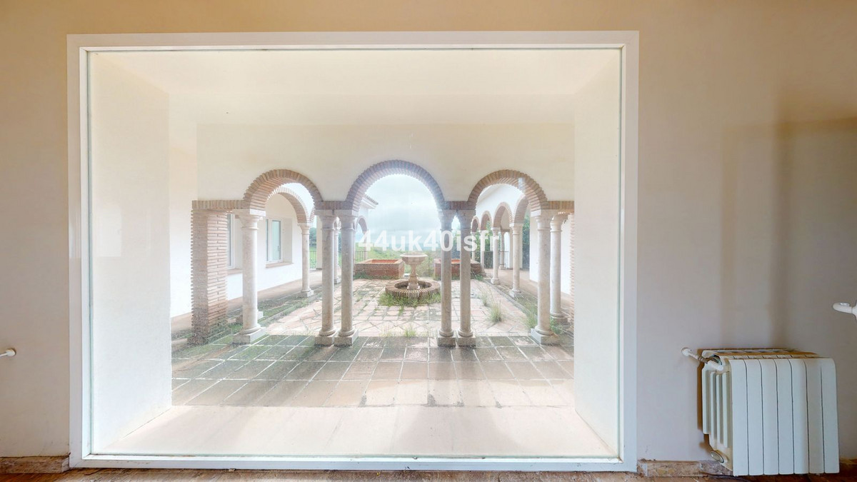 on the ground level spacious living room with kitchen and dining room with lot's of outside terrace space with arches and columns resembling the Alhambra courtyard of Granada with a water fountain in the centre