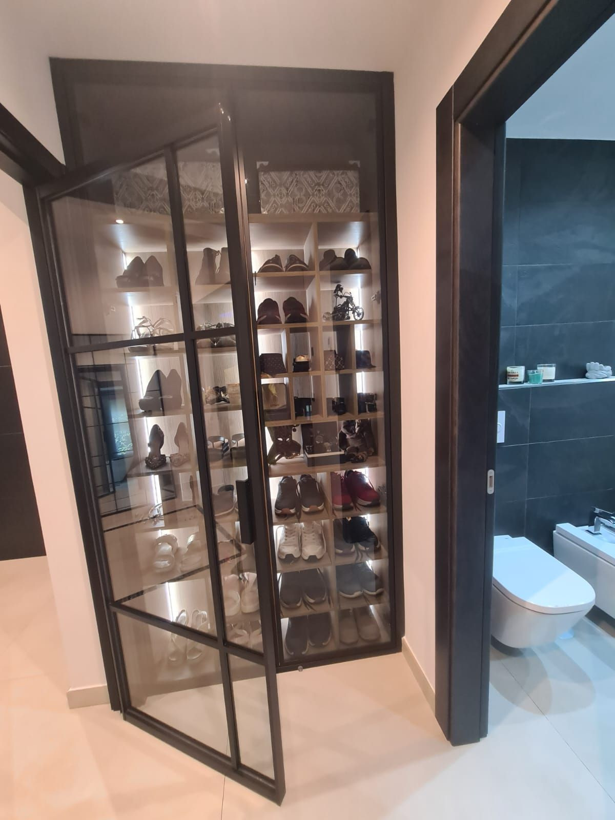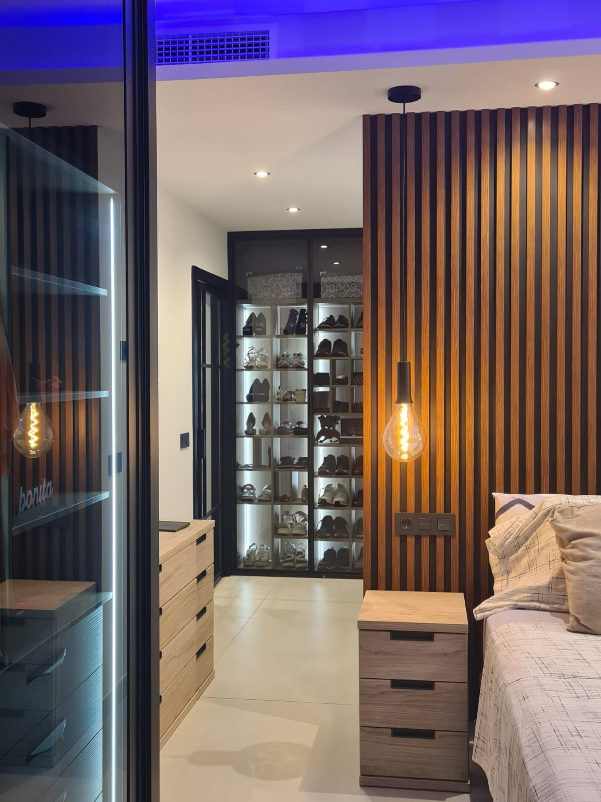 Master suite with dark glass illuminated wardrobe and shoe organiser. Modern bathroom with elegant bathtub and walk-in shower.