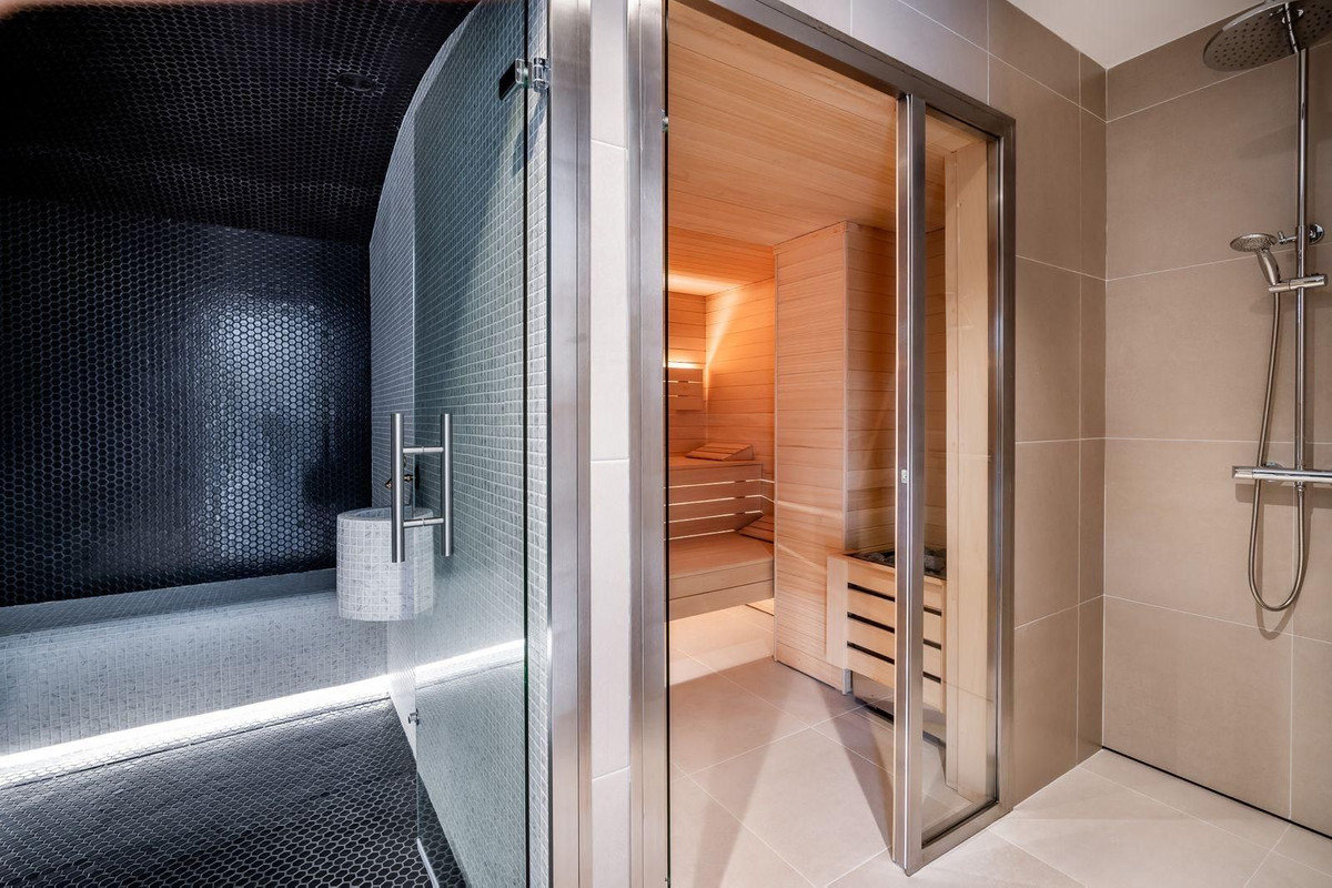 Le niveau inférieur offre des espaces polyvalents et confortables, comprenant un appartement d'invités indépendant avec accès direct au jardin et à la piscine, une chambre supplémentaire avec salle de bains, un appartement pour le personnel et un espace bien-être équipé d'un spa, d'un hammam, d'un sauna et d'une salle de relaxation.