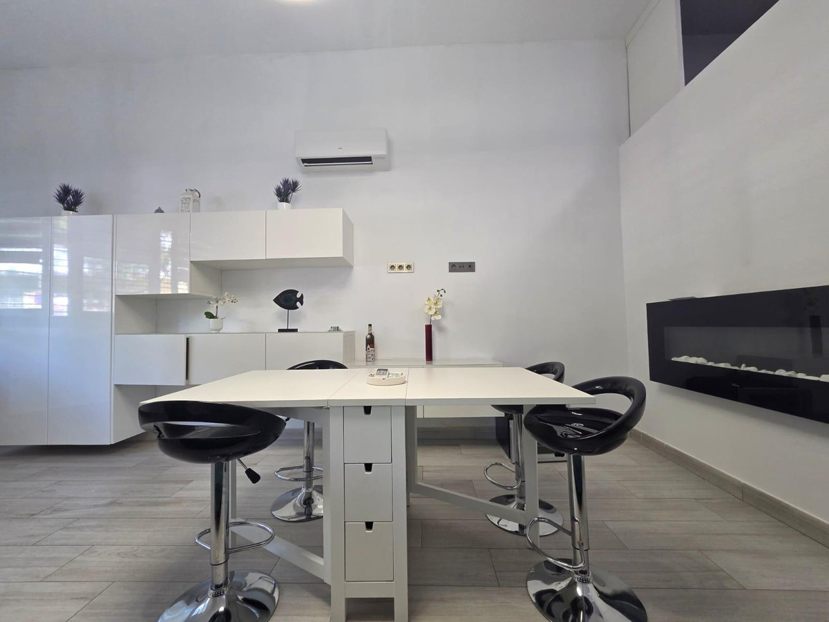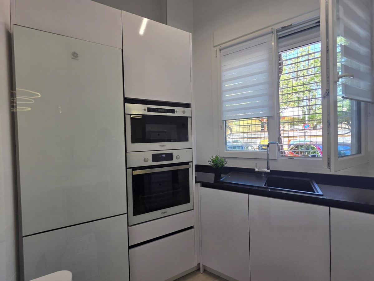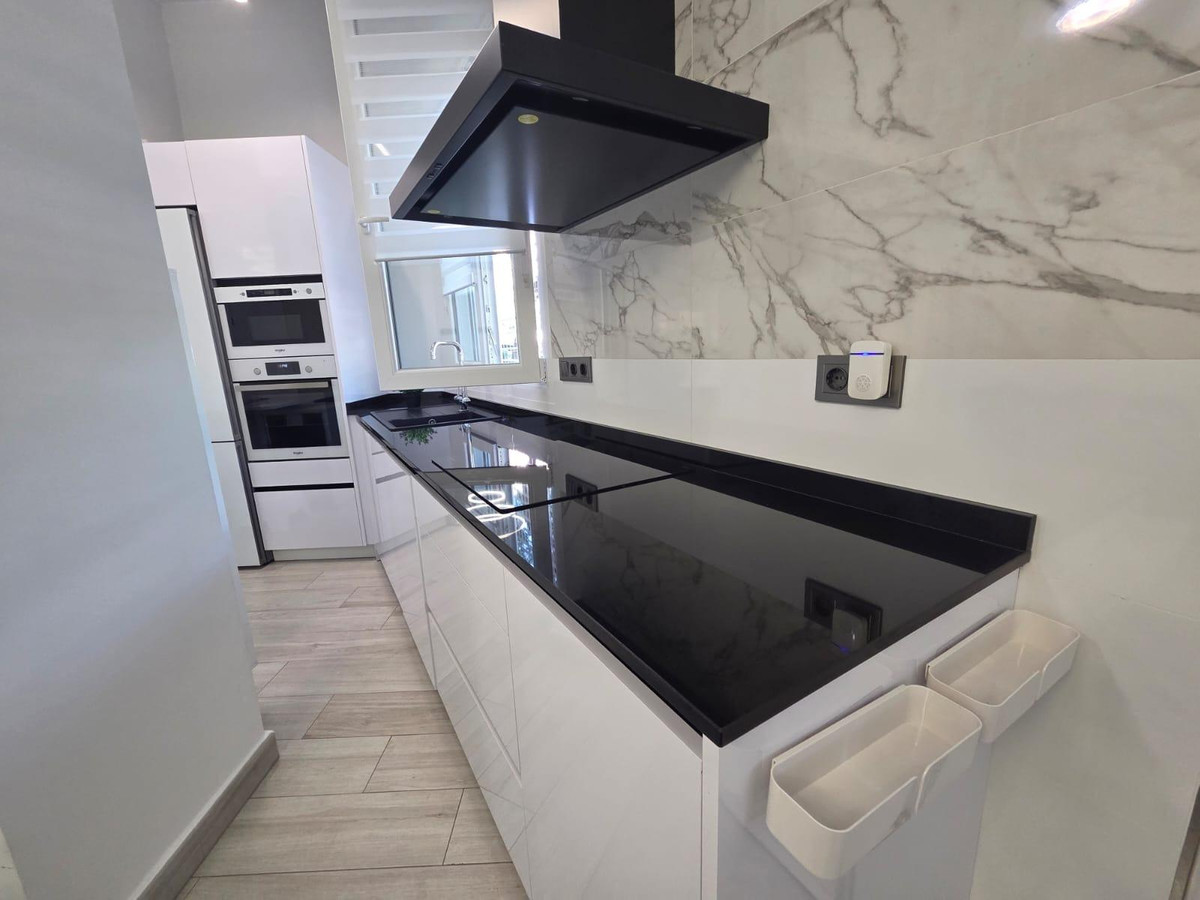 Cuisine américaine entièrement équipée : plan de travail en Silestone, plaque de cuisson vitrocéramique, lave-vaisselle, four encastré et hotte aspirante. Elle communique directement avec le séjour, créant ainsi un espace ouvert et convivial.