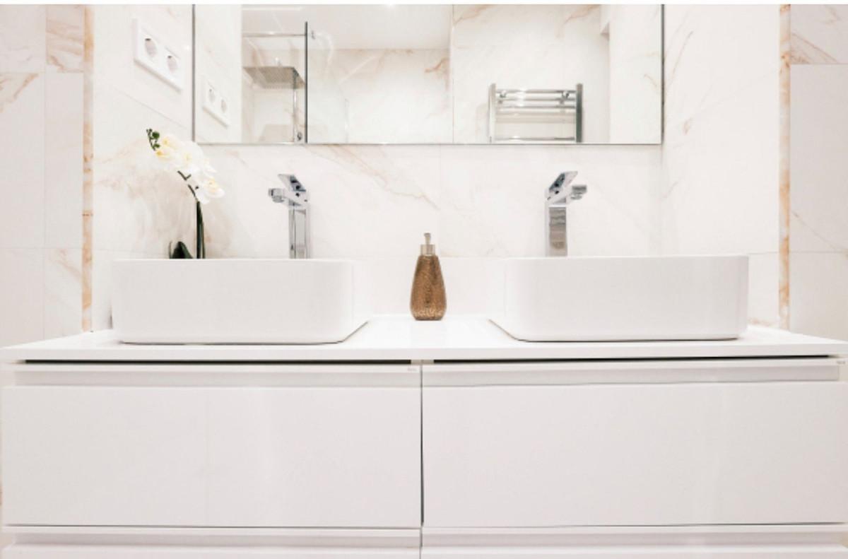 Style scandinave, salle de bains et toilettes invités flambant neuves, cuisine et salon ouverts.