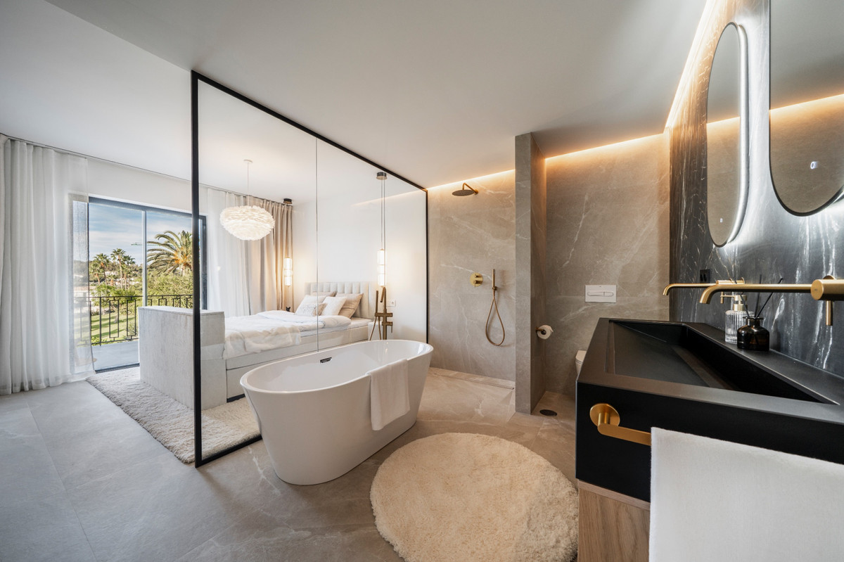 Ce niveau comprend également deux chambres d'amis partageant une salle de bain complète, ainsi que des toilettes séparées et une buanderie discrète pour plus de commodité. À l'étage, la suite parentale bénéficie d'une terrasse privative donnant sur les jardins, la piscine et les magnifiques paysages montagneux de Golf Valley. Une autre chambre d'amis avec salle de bain attenante complète l'agencement, garantissant confort et intimité à chacun. Baignée de soleil l'après-midi et en soirée, la maison est idéale pour ceux qui apprécient la vie dedans-dehors. Elle se situe à quelques pas seulement de restaurants réputés, d'un supermarché, du club de tennis et de padel Aloha et du golf Aloha.