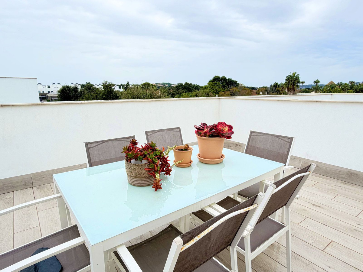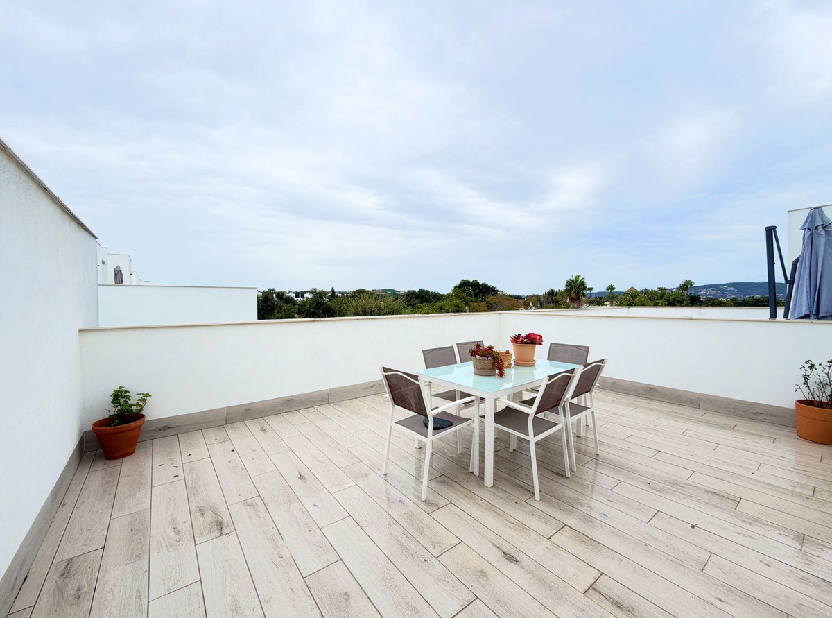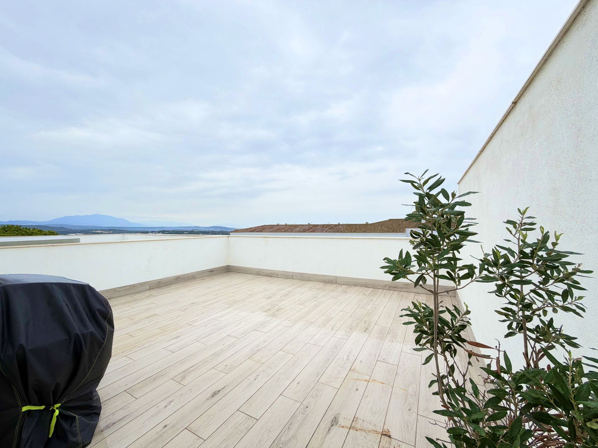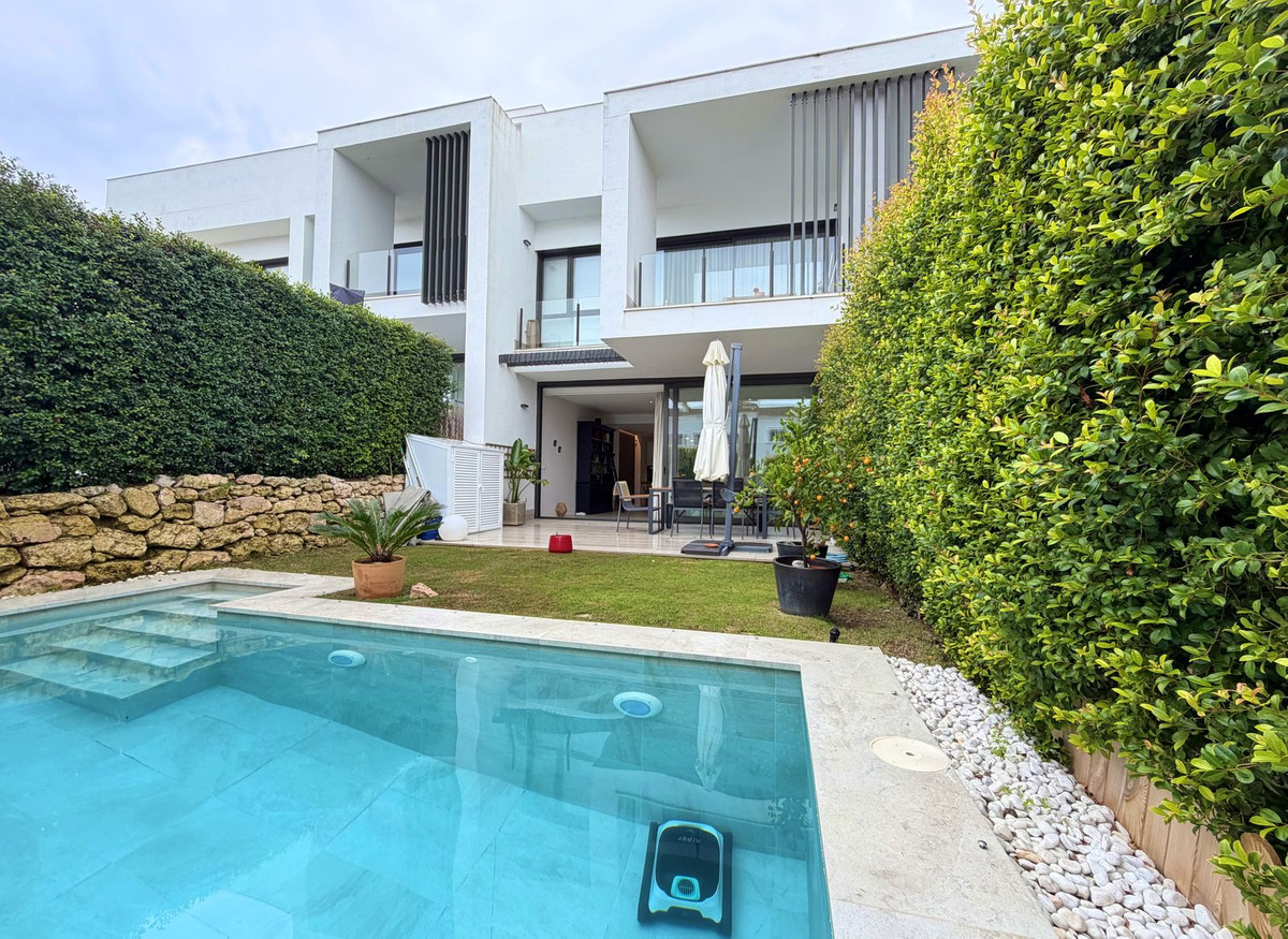 Maison de ville contemporaine située dans le prestigieux San Roque Club sur la Costa del Sol. Cette propriété allie design moderne, finitions haut de gamme et cadre naturel privilégié, ce qui en fait un choix idéal comme résidence principale ou investissement. La maison se distingue par ses volumes généreux, sa luminosité naturelle et son agencement fonctionnel. Le séjour ouvert, équipé de stores électriques et de grandes baies vitrées, donne sur une terrasse privative offrant une vue imprenable sur le golf, la mer et les jardins communs. La cuisine moderne et entièrement équipée apporte élégance et praticité à l'espace. La maison dispose de 3 chambres avec possibilité d'en aménager une quatrième, toutes dotées de placards intégrés et de finitions de haute qualité. La suite parentale comprend une salle de bains privative et un accès à une terrasse privée. Ce niveau comprend également un grand solarium offrant une vue imprenable sur le golf, la mer, les montagnes et le paysage naturel environnant. La maison est équipée d'un système aérothermique de pointe, garantissant une efficacité énergétique et un confort optimaux toute l'année. Cette maison de ville fait partie d'une résidence sécurisée 24h/24 avec jardins magnifiquement entretenus et piscine commune. Le San Roque Club offre tranquillité, intimité et exclusivité, à proximité de Sotogrande, des plages, des écoles internationales et de nombreux services. Une visite est vivement recommandée à ceux qui recherchent une qualité de vie exceptionnelle, un design soigné et un cadre de vie résidentiel raffiné dans l'un des quartiers les plus prisés du sud de l'Espagne.