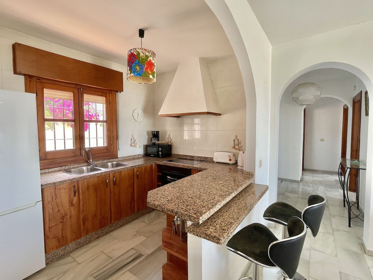 À l'intérieur, la maison dégage un charme espagnol classique, avec un salon spacieux doté d'une cheminée chaleureuse, idéale pour les soirées plus fraîches, et la climatisation pour un confort optimal toute l'année. Elle comprend deux chambres de belles dimensions avec placards intégrés et deux salles de bains, dont une suite parentale.