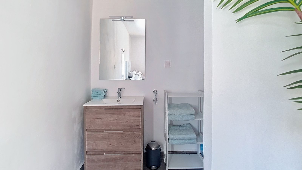 • Deuxième pièce : Actuellement aménagée en buanderie avec espace de rangement, lave-linge, sèche-linge et toilettes pour invités.