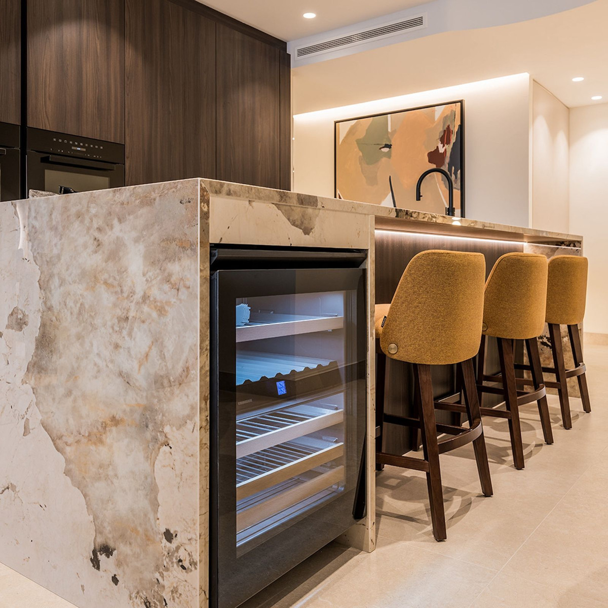 This fully remodelled 4 bedroom and 4 bathroom apartment is an amazing opportunity for people who are looking for luxury and comfort in a stunning beachfront location. The spacious living and dining room and the luxurious master bedroom with its en-suite bathroom and walk-in wardrobe both have direct access to the impressive south facing terrace with panoramic sea views. Los Granados del Mar is one of the most exclusive urbanizations on the New Golden Mile with breathtaking views of the Mediterranean Sea. Its combination of beautifully maintained gardens and luxurious facilities such as an on-site restaurant, a heated indoor pool, 2 outdoor pools, a gym, a sauna, a Jacuzzi and 24h security make this community one of a kind. It has direct beach access and is very close to all amenities, shops, schools, high class restaurants, the newly build Laguna complex and the center of Estepona. This bright 187 m² apartment boasts a brand-new open-concept designer kitchen with premium German appliances and luxurious extras, including a Bang & Olufsen sound system, an electric fireplace, and a freestanding bathtub. Underground parking with direct lift access to the apartment as well as a secure storage room are included in the price.