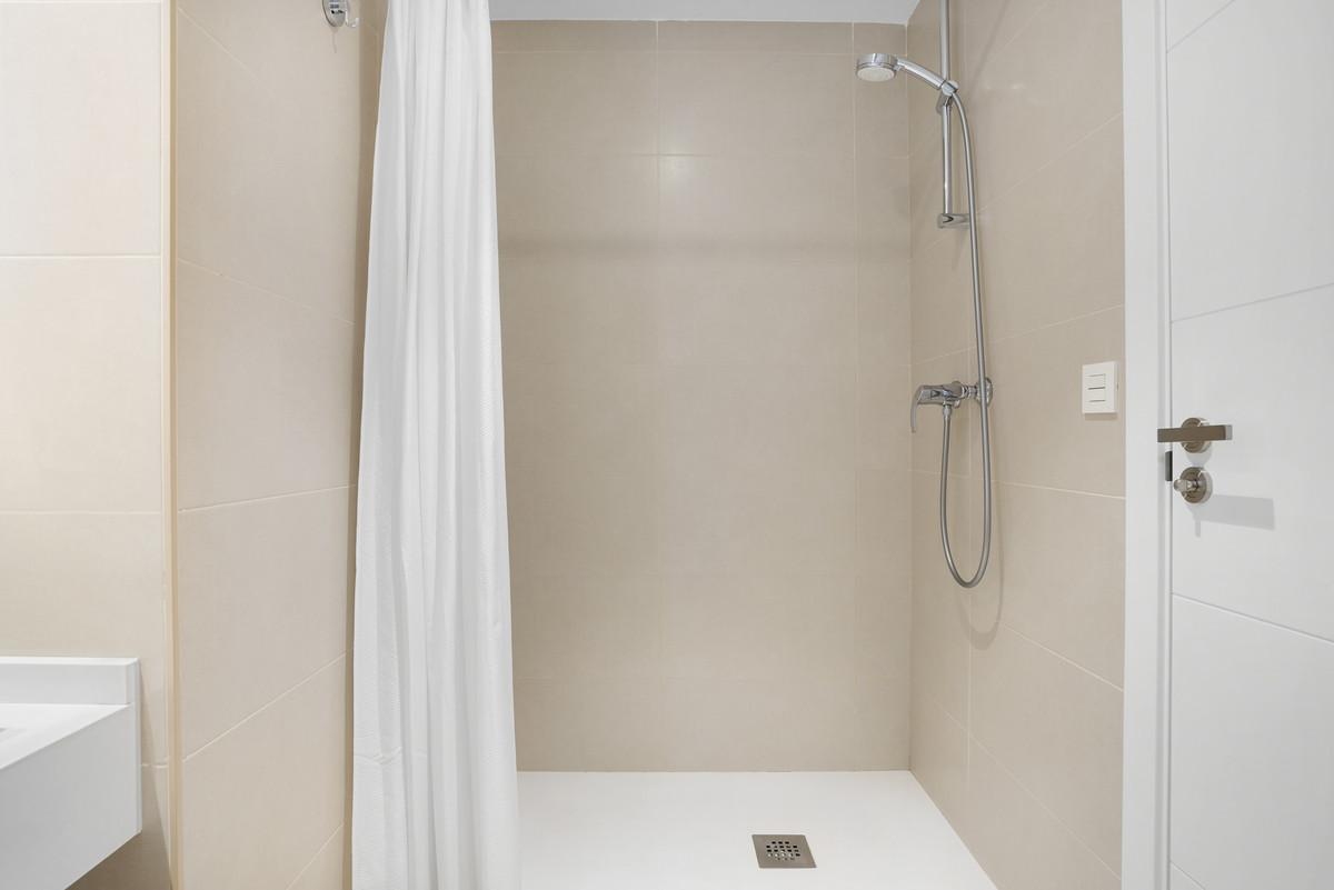 The heart of the apartment is the open-plan kitchen, flowing seamlessly into the bright living and dining area. Large sliding glass doors open onto the spacious south-facing terrace, perfect for al fresco dining, relaxing, or enjoying the Mediterranean sunshine. The interiors are light-filled, airy, and designed for modern coastal living, combining neutral tones with high-quality finishes.