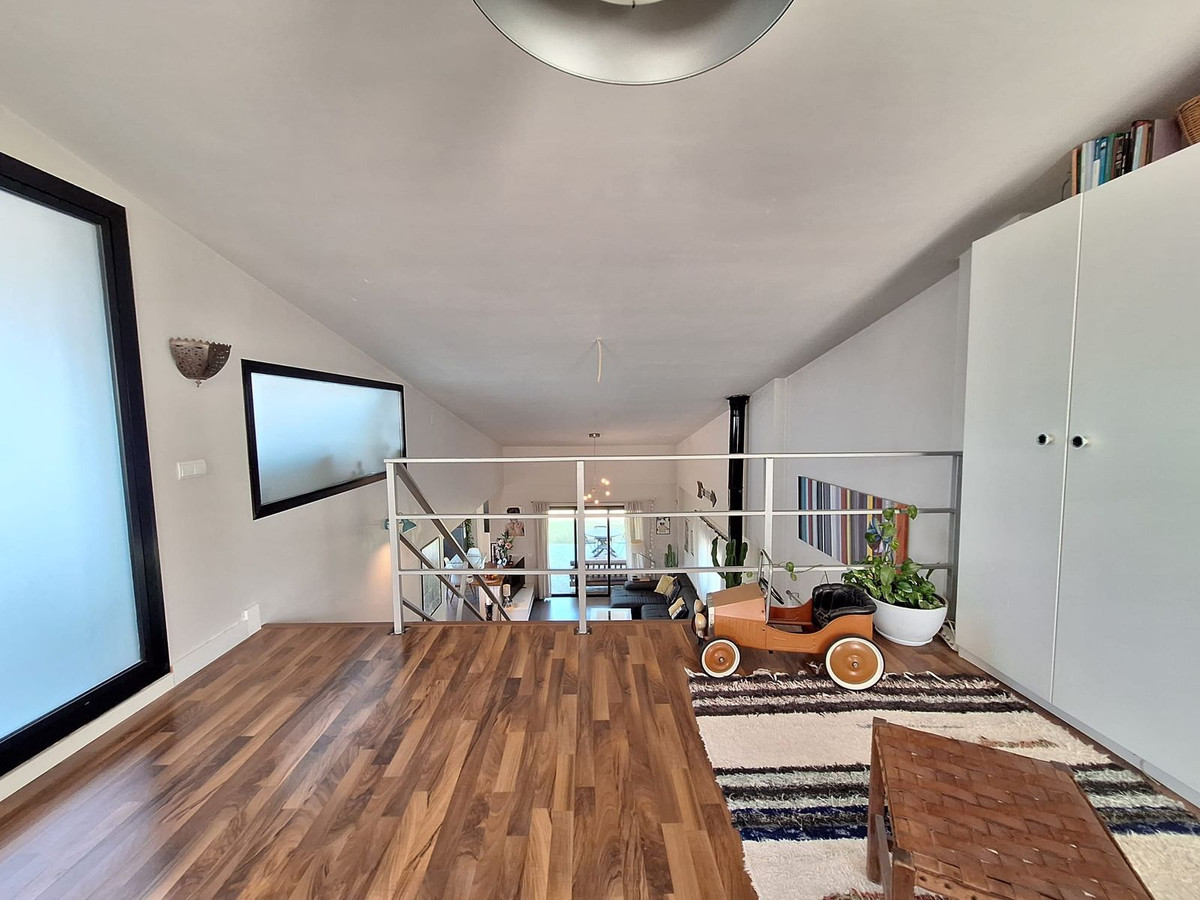 Main Floor: Bright open-plan living and dining room with fireplace and direct access to the rear porch and garden. Fully equipped open-concept kitchen. This floor also features a bathroom with shower and two spacious bedrooms, one of them with an en-suite bathroom. Large double-glazed windows throughout flood the space with natural light and ensure excellent cross ventilation, keeping the home cool in summer.