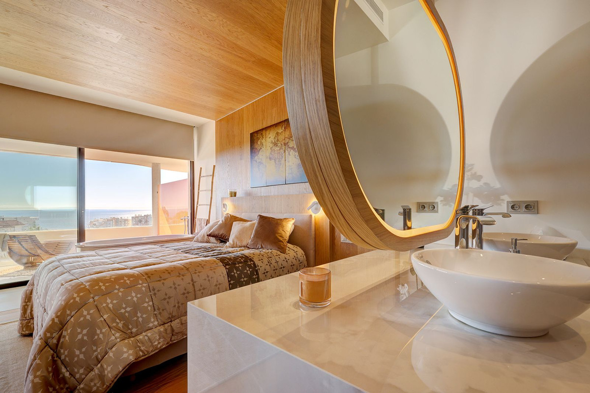 Benefiting from a direct south orientation, the home enjoys beautiful natural light throughout the day and lovely sea views from the living area and terrace. The interior combines modern design with warm, high-quality finishes. The layout is smart and open, with floor-to-ceiling windows that enhance brightness and space. The master bedroom features a sliding wall that opens onto the living room, adding a luxurious and flexible design element.