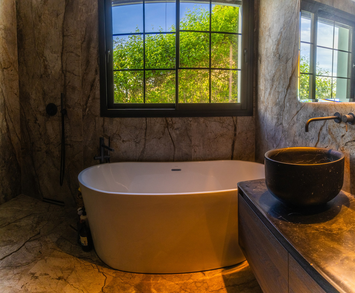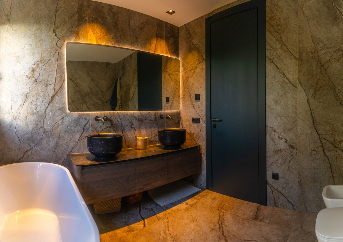This villa features superior finishes including natural stone accents, a Porcelanosa staircase, and high-grade ceramic flooring. It is equipped with double-glazed windows with an argon chamber and Guardian Sun glass for optimal insulation and energy efficiency.