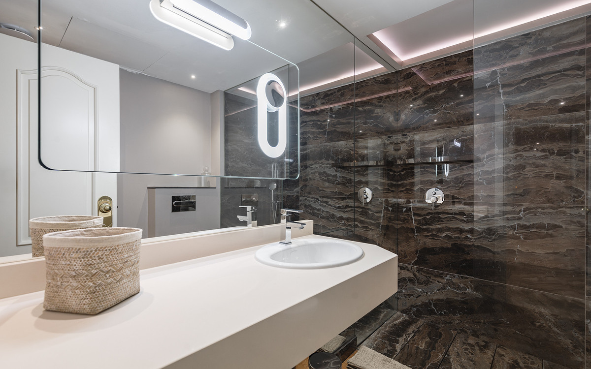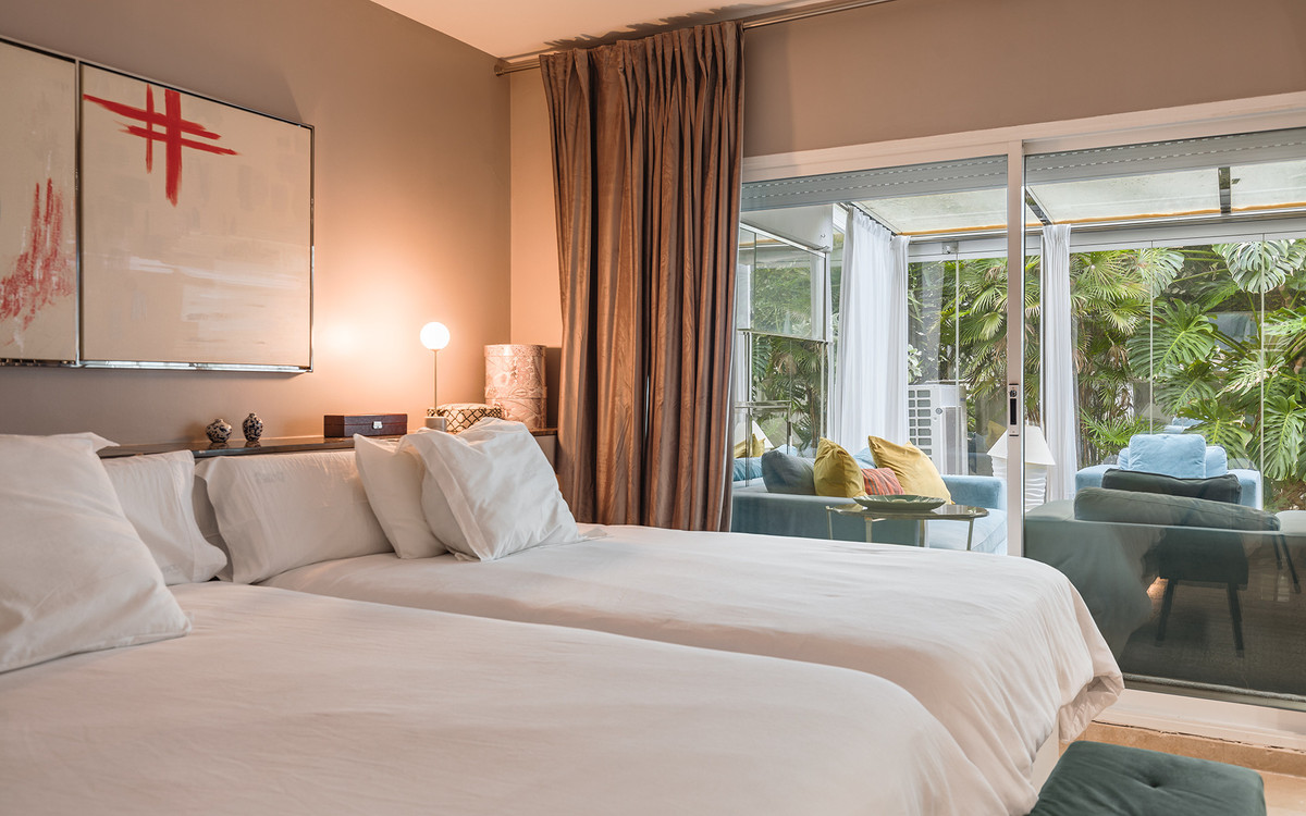 Exquisitely presented ground-floor apartment located in a 24-hour secured complex in Las Lomas del Marbella Club, in the heart of the Golden Mile. The property has been completely renovated and makes incredible use of the open floor plan that blends the kitchen, living room and large outdoor terrace seamlessly. Large floor-to-ceiling windows open up from the living room to a lush tropical garden and covered terrace with adjustable glass curtains that can be opened in the summer months to provide an incredible entertaining space within a very private setting. The apartment makes the most of the square meters and provides two spacious bedrooms, each with their own en-suite bathroom. The master bedroom opens up and connects with the large terrace towards the back of the unit. The complex offers an outdoor pool with wonderful sea views, gym and sauna for residents. The property comes with 1 parking space and a large storage room. Situated in a sought-after area, approximately half-way between Marbella Town and Puerto Banús.