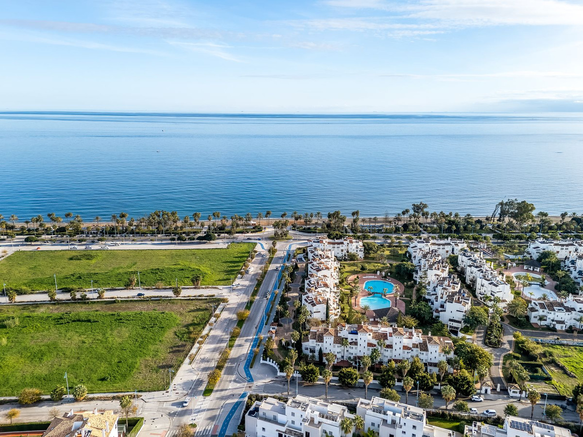 Jade Beach is a modern residential complex in San Pedro de Alcántara, built by Taylor Wimpey in 2016. The property is a corner penthouse with three bedrooms and two bathrooms, featuring a spacious terrace on the main floor and a private rooftop terrace with a jacuzzi. The complex offers a communal swimming pool, landscaped gardens, two parking spaces, and one storage room. It is located within walking distance to the beach, the town centre of San Pedro, and the NAC padel club. The apartment enjoys views over the pool, garden, and surrounding mountains. As one of the few new developments in the San Pedro beachside area, Jade Beach provides contemporary living in a prime location, just a short walk from all amenities.