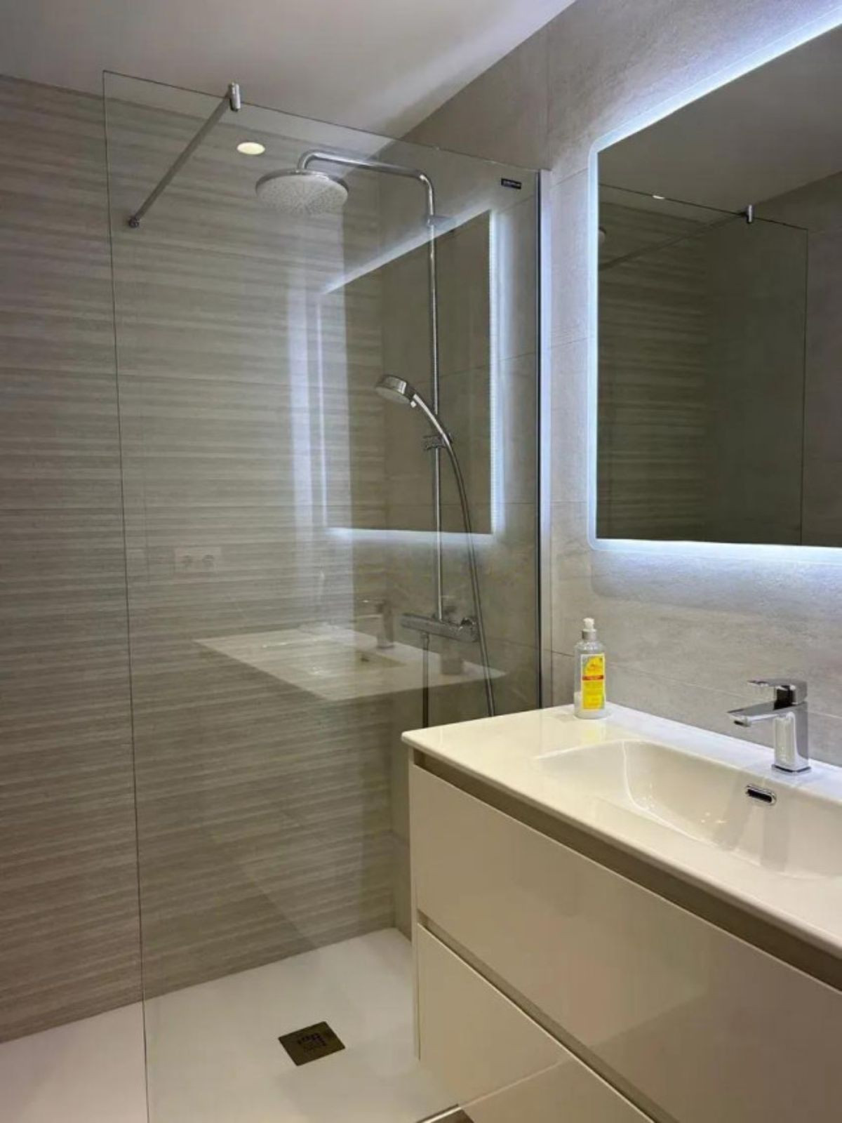 Appartement rénové à vendre. Une chambre, salle de bain neuve, cuisine américaine avec de nombreux rangements, deux placards intégrés, climatisation réversible et radiateurs électriques. Peinture lisse. Éclairage indirect à intensité réglable et spots encastrés pour créer différentes ambiances. Très lumineux. Prises design dissimulées. Sur la terrasse, un local technique a été aménagé pour la machine à laver et des rangements. L'appartement est équipé d'un lave-linge séchant. Store électrique. L'appartement offre une surface habitable de 58 m² et la terrasse de 30 m². Chauffe-eau neuf. L'eau est incluse dans les charges de copropriété. Possibilité d'aménager une deuxième chambre grâce à la grande surface habitable. Résidence calme conçue par l'architecte Fernando Higueras, avec jardin tropical, deux piscines, fontaines, rivière artificielle avec poissons, grenouilles et canards. Accès piéton direct à la plage, sans traverser la route. Deux douches sont à disposition pour se rincer après la plage. Accès direct à la piscine depuis la plage.