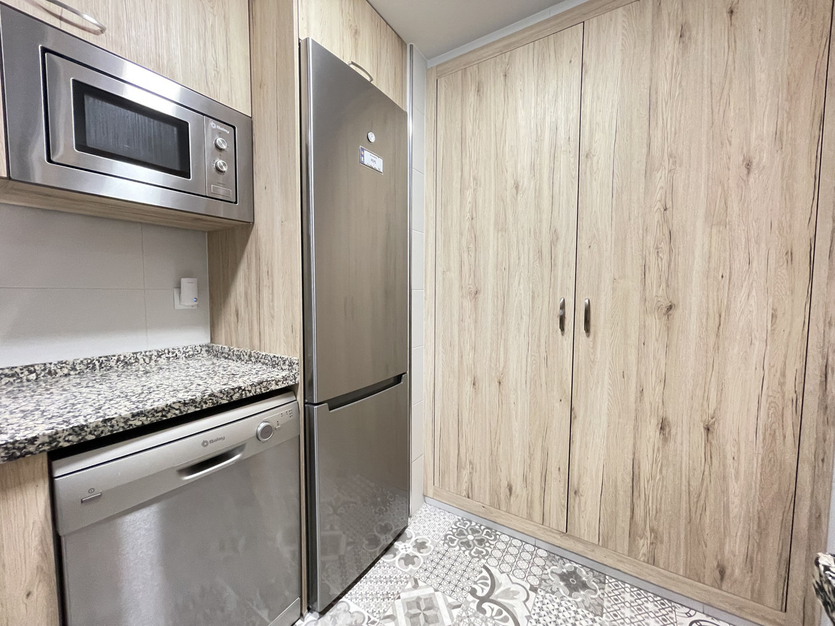 Ce bien, quasiment neuf après une rénovation complète, comprend deux chambres et une salle de bains. Parmi ses pièces, un dressing spacieux offre un espace de rangement optimal. L'appartement est climatisé et dispose de carrelage au sol et de placards intégrés, des éléments qui allient confort et fonctionnalité. La cuisine entièrement équipée comprend une buanderie pratique.