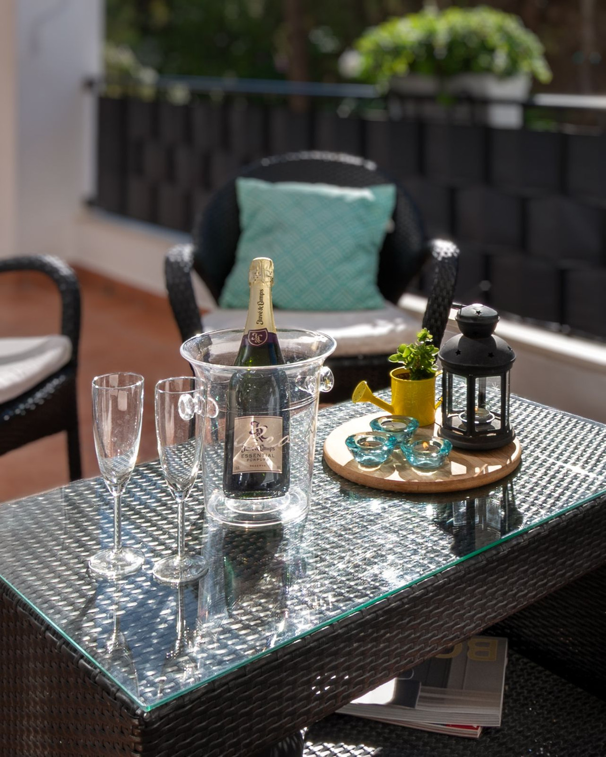 Terrasse exposée sud-ouest, très spacieuse (22 m²), idéale pour les repas, les bains de soleil, les barbecues, etc. Vue sur le jardin et la piscine et accès direct à ces espaces. Couverte et équipée de stores pour une protection solaire optimale. Livrée entièrement meublée.
