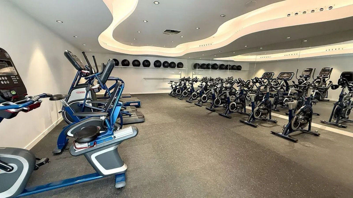 Salle de sport entièrement équipée et studio de yoga/fitness avec miroirs