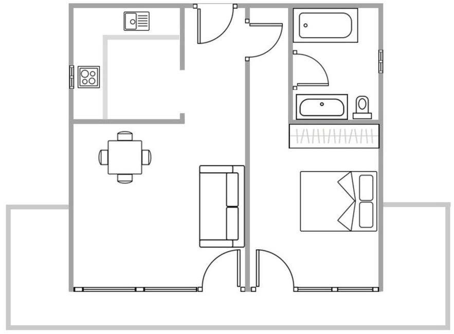 Spacious one-bedroom apartment featuring an independent kitchen, a bathroom with bathtub, and a terrace of approximately 10 m² with northwest orientation, perfect for enjoying the afternoon sun.