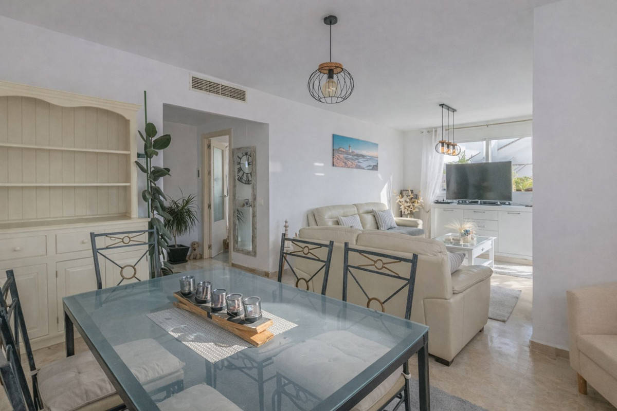 The well-maintained property comprises two bedrooms, including a master bedroom with en-suite bathroom, a second bedroom, and an additional full bathroom. The kitchen is fully fitted and equipped with high-quality appliances: ceramic hob, oven, combi fridge, dishwasher, and a new extractor hood, along with a laundry room with patio access. Hot water is provided by a new electric water heater.