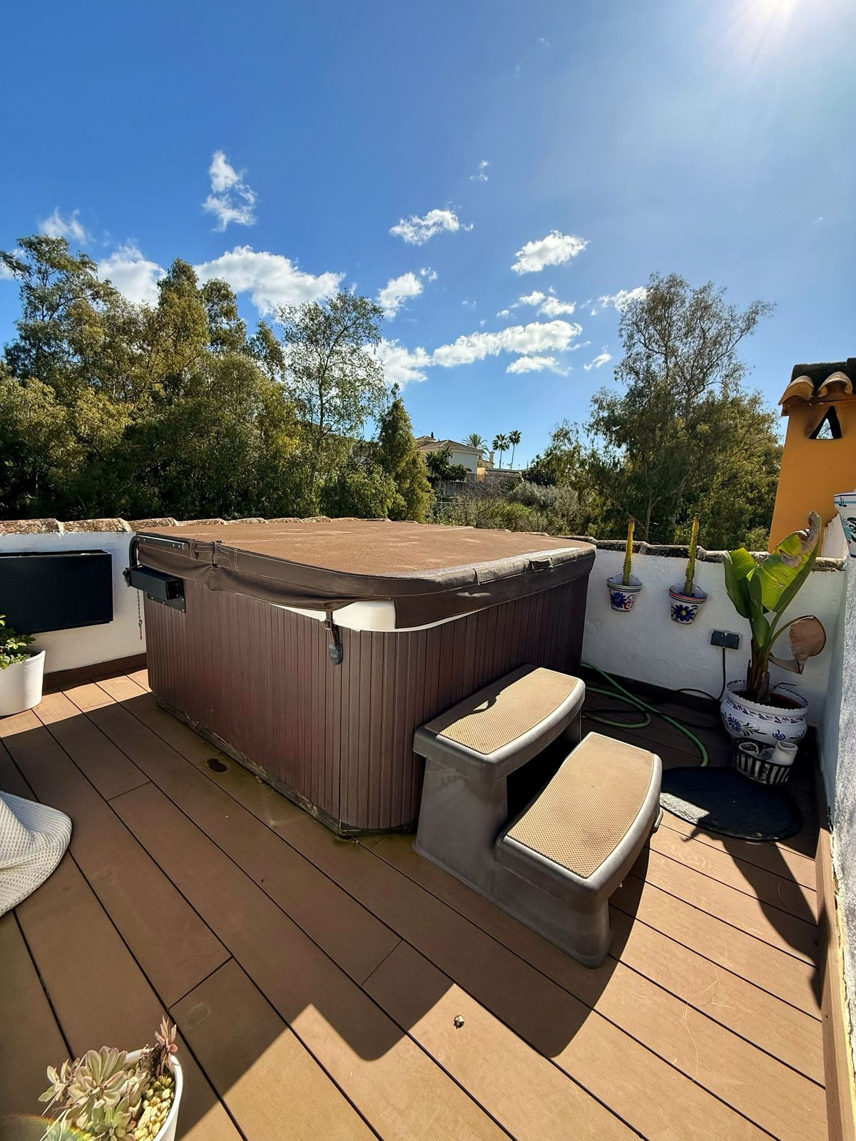 The property has been newly renovated and offers approximately 200 m² of plot size and 110 m² of usable living space, distributed over two floors plus a stunning solarium with jacuzzi. The southwest orientation ensures natural light throughout the day.