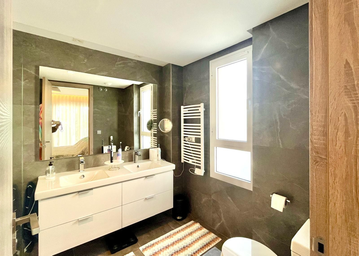 The main living area consists of a bright living-dining room with large floor-to-ceiling windows, opening onto a sleek, fully fitted kitchen, ideal for everyday use or for entertaining in a relaxed atmosphere. The current decoration highlights clean lines, quality materials and a warm ambiance, with the possibility of keeping an Italian-inspired design layout for a very sophisticated finish.
