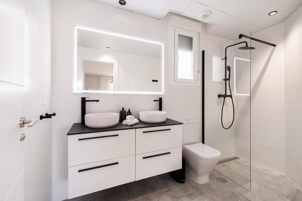 The property offers two beautifully appointed bedrooms, including a tranquil master suite with direct terrace access and an elegant en-suite bathroom. Both bathrooms are finished to an exceptional standard, featuring walk-in rainfall showers, contemporary fixtures, floating vanity units, and ambient LED lighting. A separate laundry/utility room adds further practicality to this refined home.