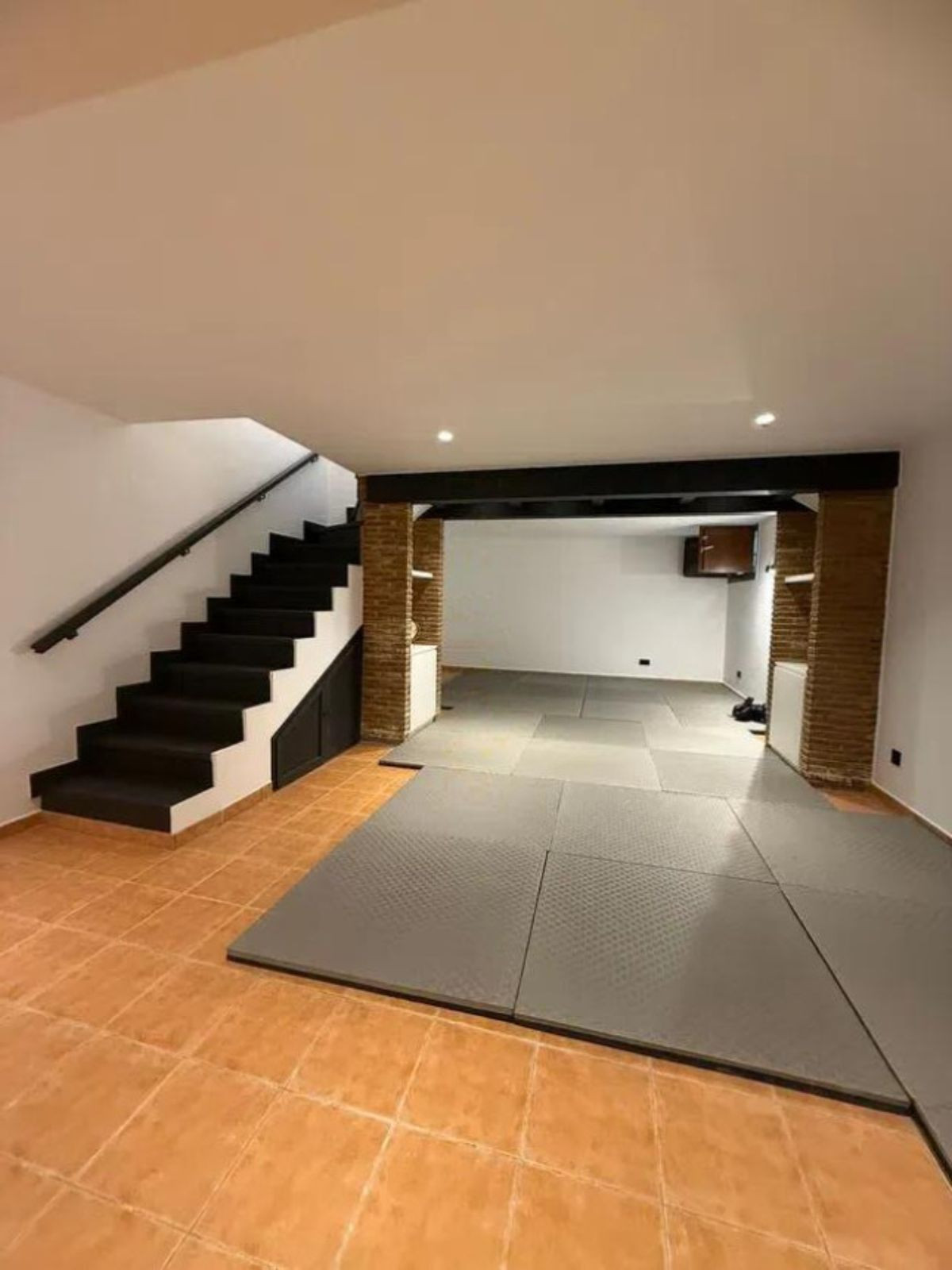 Ground floor open-plan kitchen opening onto the living room, toilet, and large terrace with a 2x3 meter saltwater pool, independent garage.