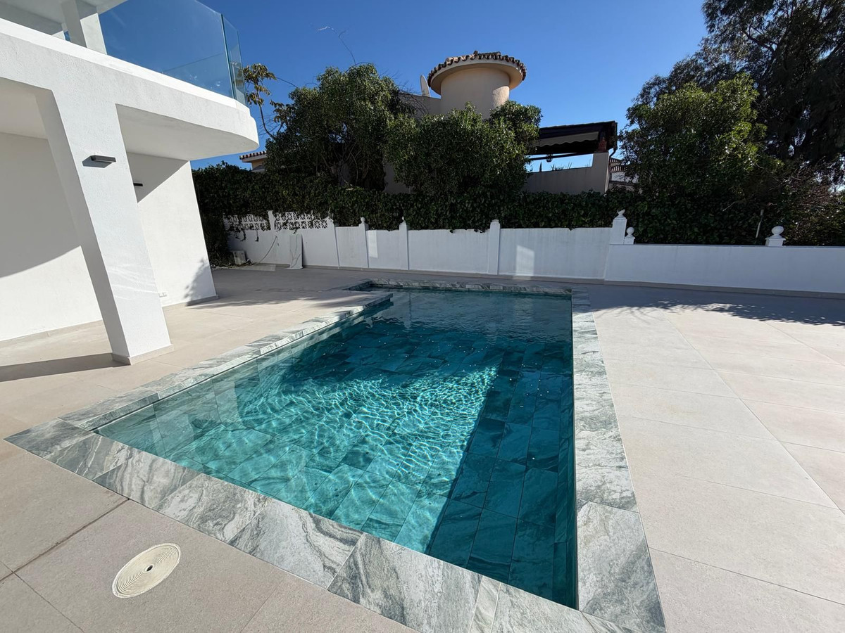 The property includes three spacious bedrooms, all en-suite, and a total of five bathrooms, ensuring comfort and privacy for all. Every room is equipped with independent air conditioning, providing year-round climate control.