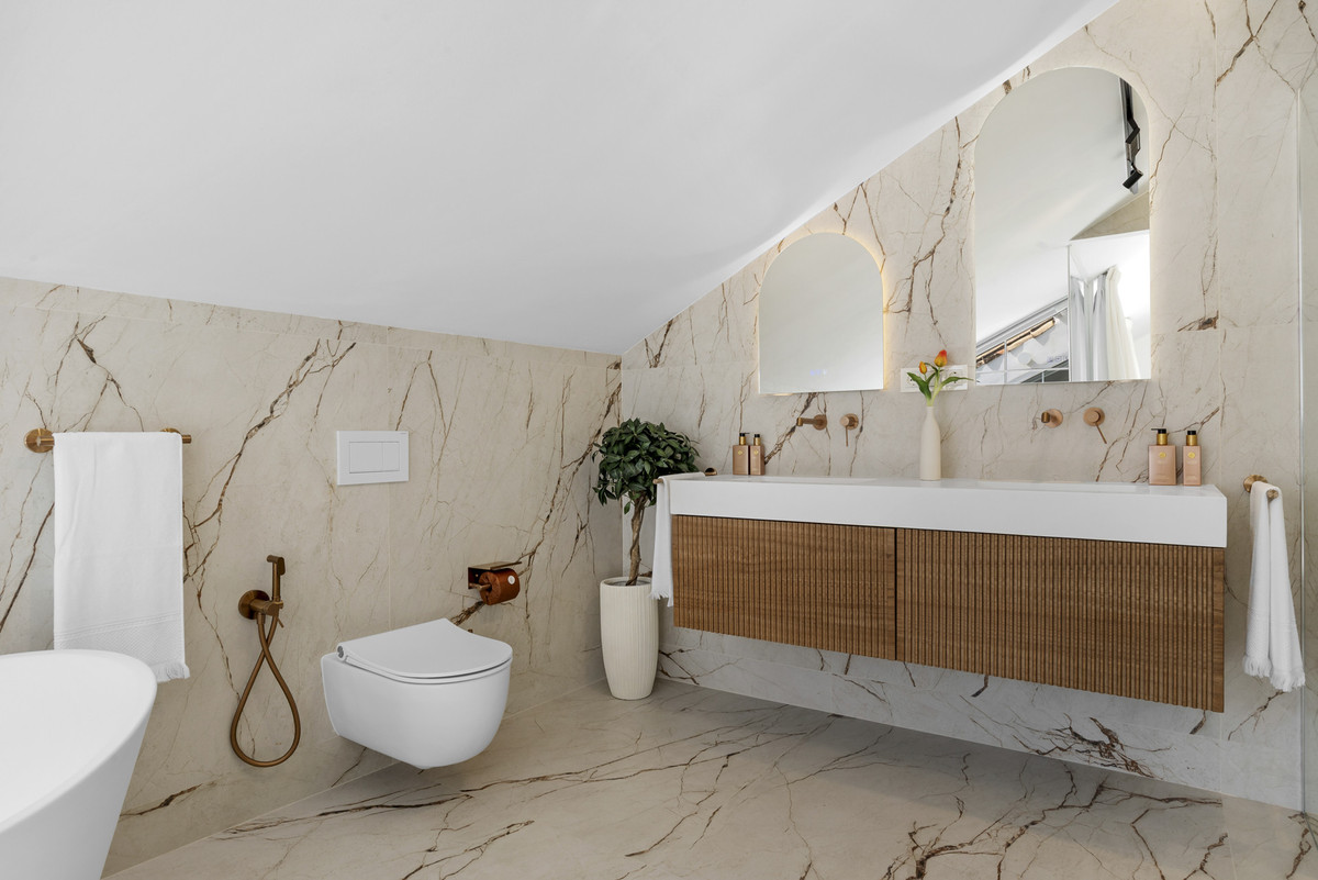 The penthouse includes five beautifully designed bedrooms, including a spectacular master suite on the upper level. With slanted ceilings, a generous walk-in closet, a spa-inspired bathroom, and a private terrace overlooking the sea and La Concha mountain, this is an oasis of complete relaxation. Two additional bedrooms feature en-suite bathrooms, while two share a modern family bathroom. A flexible fifth room serves perfectly as a guest bedroom or office. A separate laundry room with terrace access shows that even the practical details have been given the same attention.