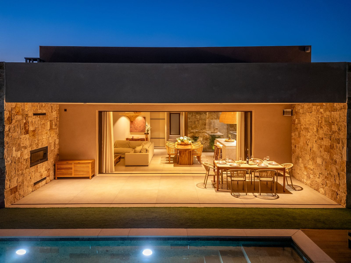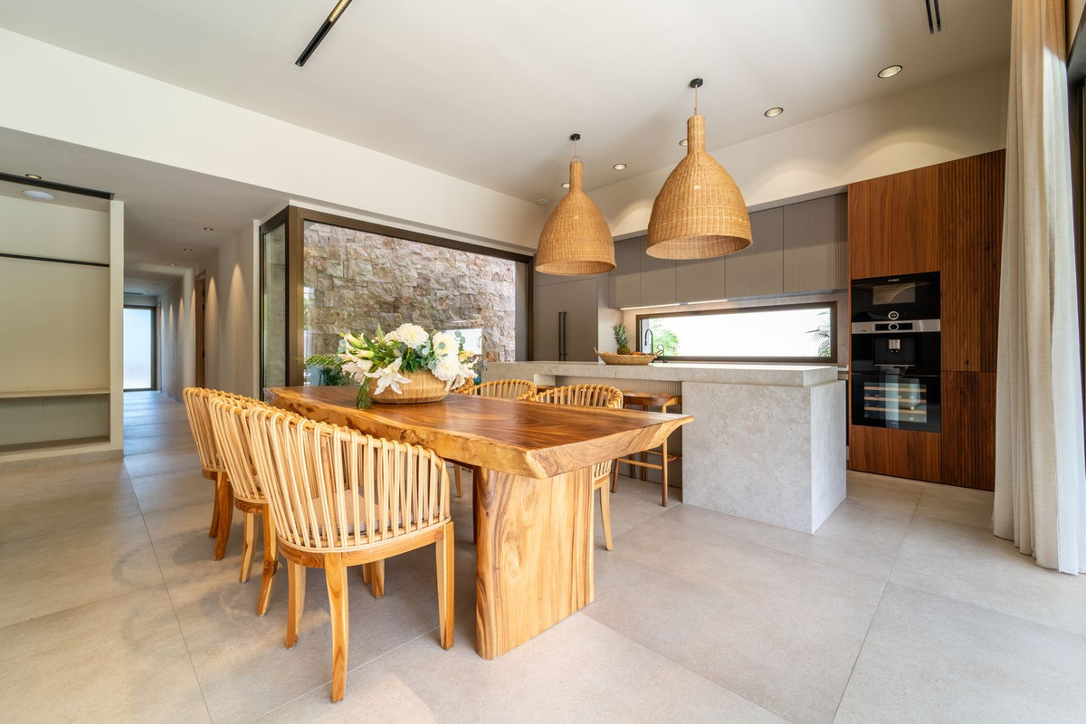 The villa features a fully equipped kitchen integrated into a spacious open-plan living and dining area, creating a modern and welcoming atmosphere with high-quality furniture, worktops and appliances.