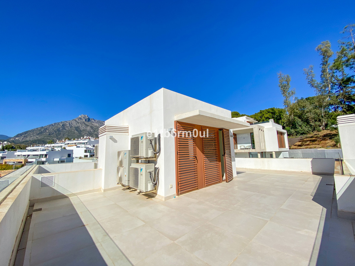 New semi detached villa in the heart of the Golden Mile, Marbella, with tourist license in place. Only 300m from the beach and the Puente Romano. Five-minute drive from Marbella Centre and Puerto Banus. 24-hour security communal pool, gym and spa. Perfect opportunity to own a three bed ( 4th in the basement ) three bath, brand new semi-detached house with private plunge pool. Open plan kitchen, living room leading out to private garden on the ground floor with guest WC. 1st floor hosts three bedrooms , one en-suite, two sharing a bathroom. On the 2nd floor a magnificent solarium with views to the concha mountain. Basement floor living room, 4th bedroom and bathroom. Two car parking spaces with direct access to the house and storage space are also included.