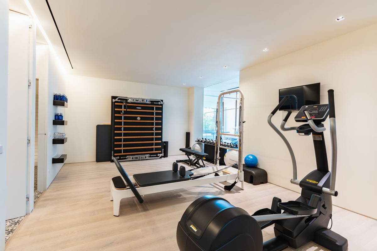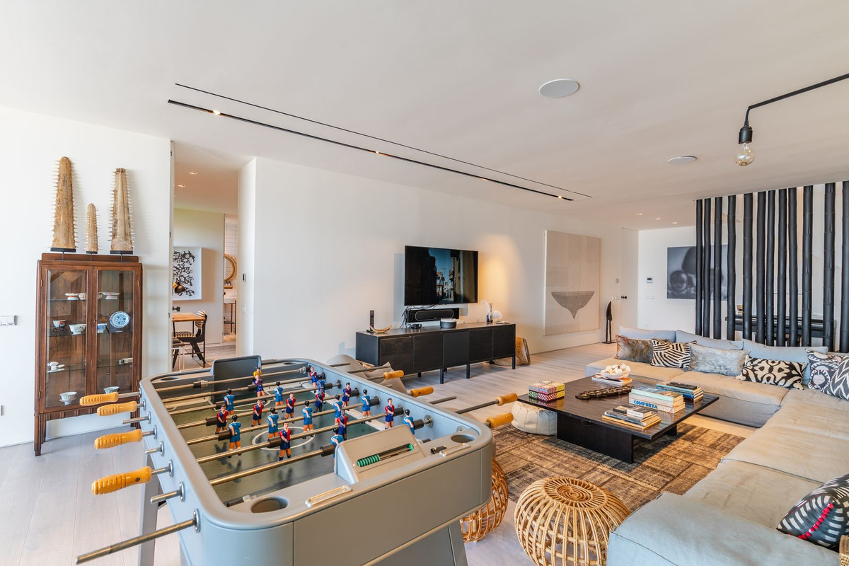 The lower level offers exceptional versatility, with three additional bedrooms (one currently used as an office), a generous TV and lounge area, a fully equipped gym and a sauna. This level opens onto a covered terrace, currently used as a games area, with the flexibility to adapt it to different needs. From here, the path leads directly to the swimming pool, once again situated to take full advantage of the beautiful coastal outlook.