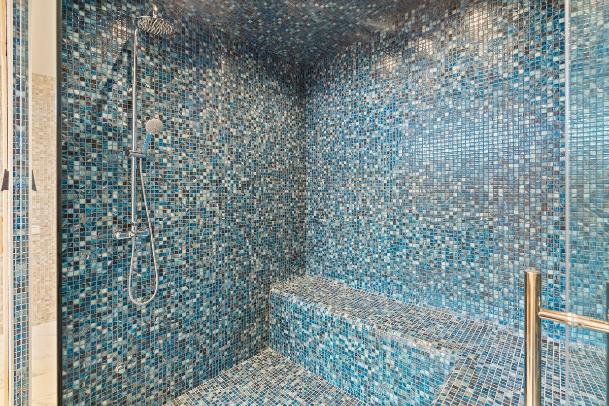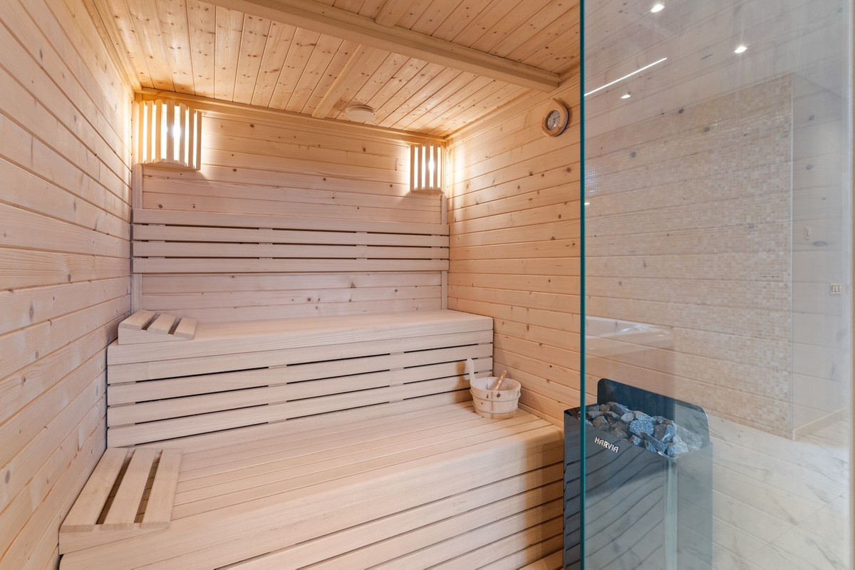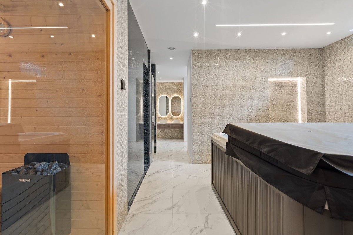 The lower level is designed for both comfort and leisure, offering a private gym and spa area with sauna, jacuzzi, and hammam, along with entertainment spaces, staff accommodation, storage, and utility rooms. The villa is equipped with underfloor heating, advanced climate control, double glazing, and a fireplace. Energy efficiency is enhanced through photovoltaic solar panels with FVE battery system and solar water heating.